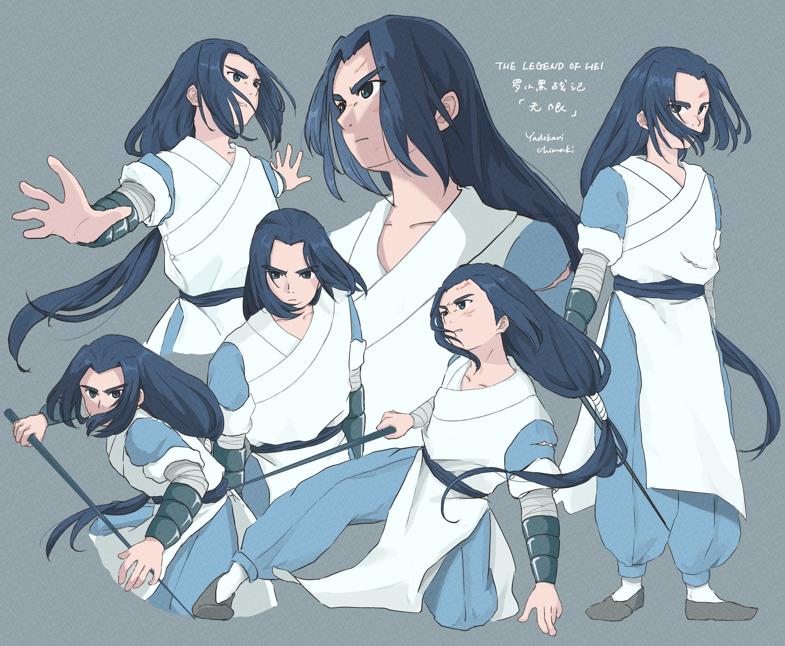 1boy artist_name black_footwear black_hair copyright_name grey_background highres holding long_hair low-tied_long_hair multiple_views shoes simple_background luo_xiaohei_zhanji wuxian_(the_legend_of_luo_xiaohei) yadokari_chimaki