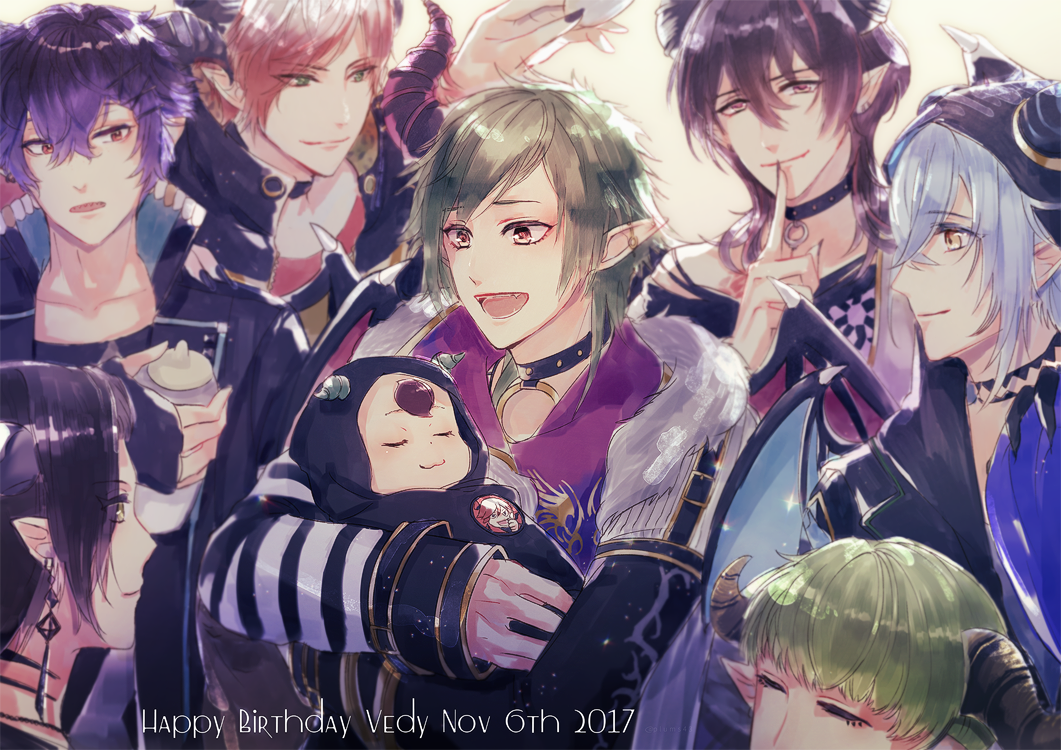 2017 6+boys acedia_(yume-100) black_hair blue_hair character_name dated demon_boy demon_horns demon_wings grad_(yume-100) green_eyes happy_birthday horns ira_(yume-100) las_(yume-100) looking_at_viewer male_focus multicolored_hair multiple_boys plums43 pointy_ears purple_eyes purple_hair short_hair superbia_(yume-100) vashti_(yume-100) vedy_(yume-100) wings yellow_eyes yume_oukoku_to_nemureru_100-nin_no_ouji-sama
