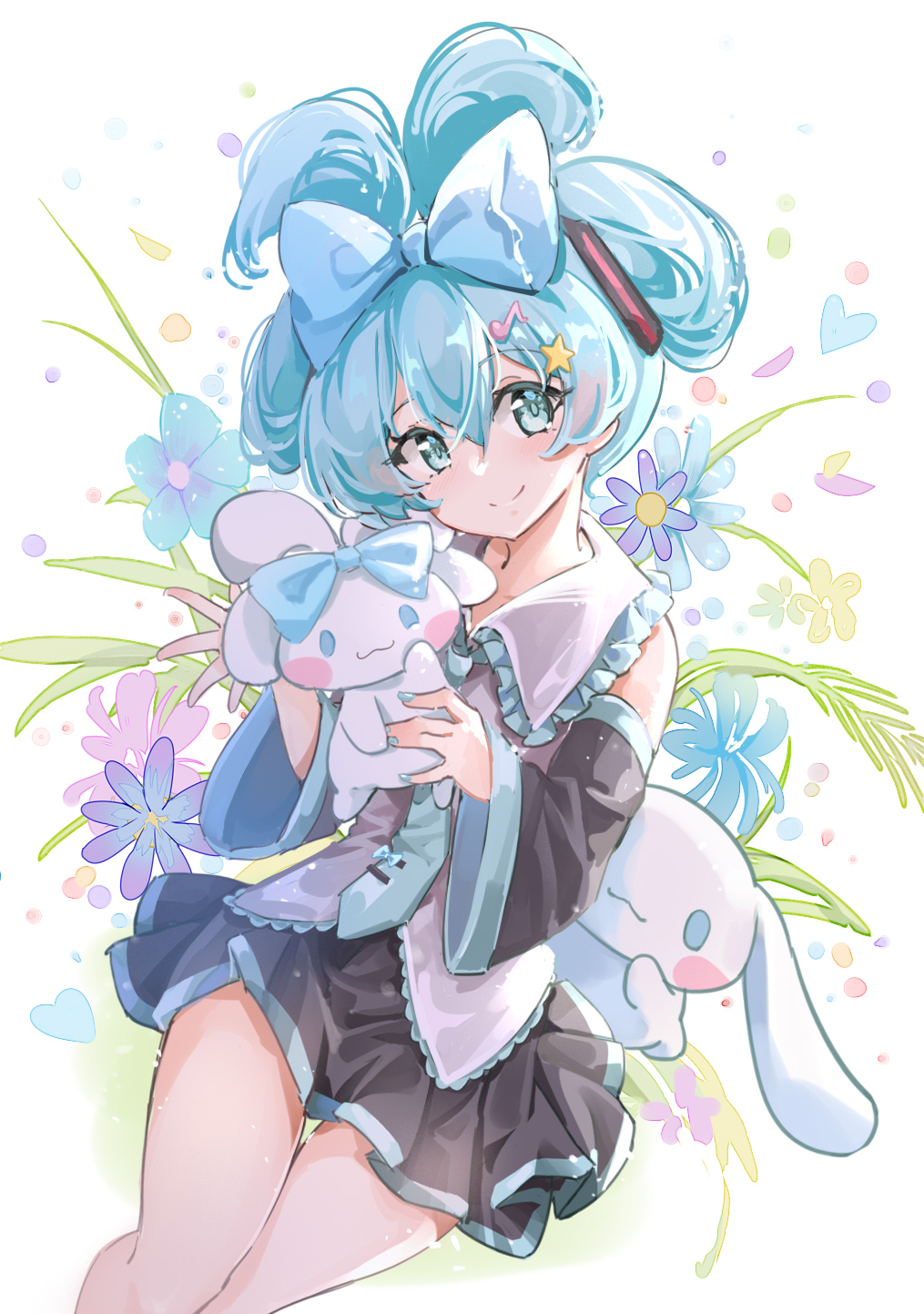 1girl black_sleeves blue_bow blue_eyes blue_hair blue_necktie bow cinnamiku cinnamoroll closed_mouth collared_shirt commentary detached_sleeves fortissimo frilled_shirt_collar frills fuwa_fuwa_cinnamoroll hair_between_eyes hair_bow hair_ornament hatsune_miku highres holding miniskirt musical_note musical_note_hair_ornament necktie pleated_skirt sanrio scarlet_dango shirt sitting skirt sleeveless sleeveless_shirt smile star_(symbol) star_hair_ornament untranslatable_commentary tie_clip vocaloid white_shirt