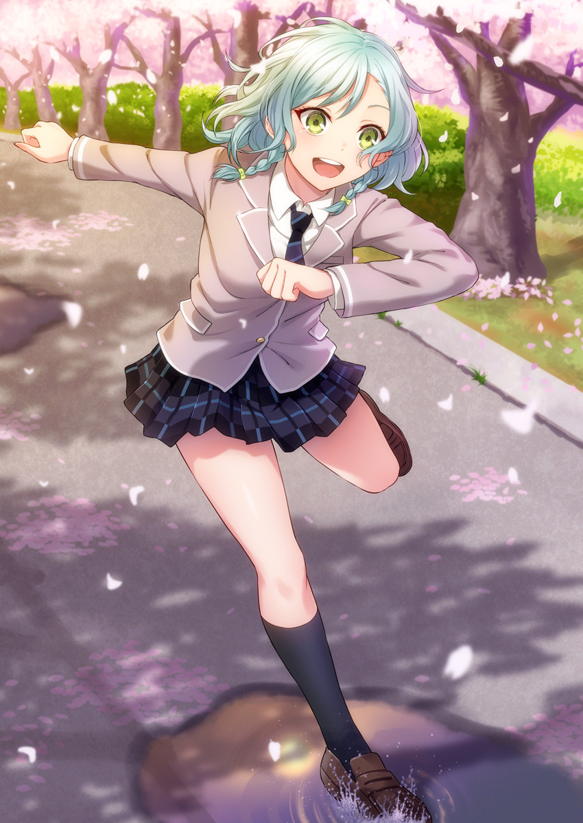 1girl :d aqua_hair bad_id bad_pixiv_id bang_dream! bang_dream!_girls_band_party! black_necktie black_skirt black_socks blazer braid brown_shoes cherry_blossoms collared_shirt commission green_eyes grey_jacket haneoka_school_uniform highres hikawa_hina jacket kanden_sky kneehighs leg_up miniskirt necktie open_mouth petals pixiv_commission plaid_clothes plaid_skirt pleated_skirt school_uniform shirt shoes short_hair side_braids skirt smile socks solo twin_braids white_shirt