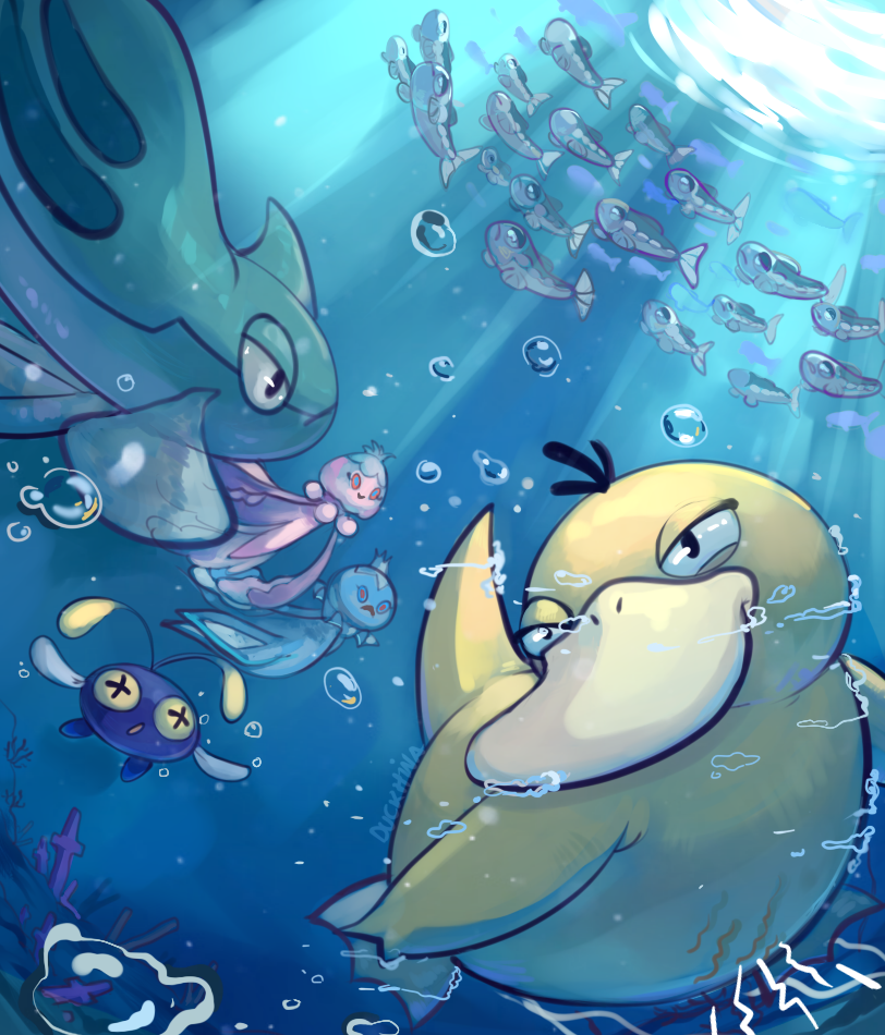 +_+ :o air_bubble bird black_eyes bubble chinchou closed_mouth commentary duck duckhina fish frillish frillish_(female) frillish_(male) from_below gen_1_pokemon gen_2_pokemon gen_5_pokemon gen_7_pokemon jellyfish light_rays nintendo no_humans open_mouth pokemon pokemon_(creature) psyduck remoraid signature underwater wishiwashi