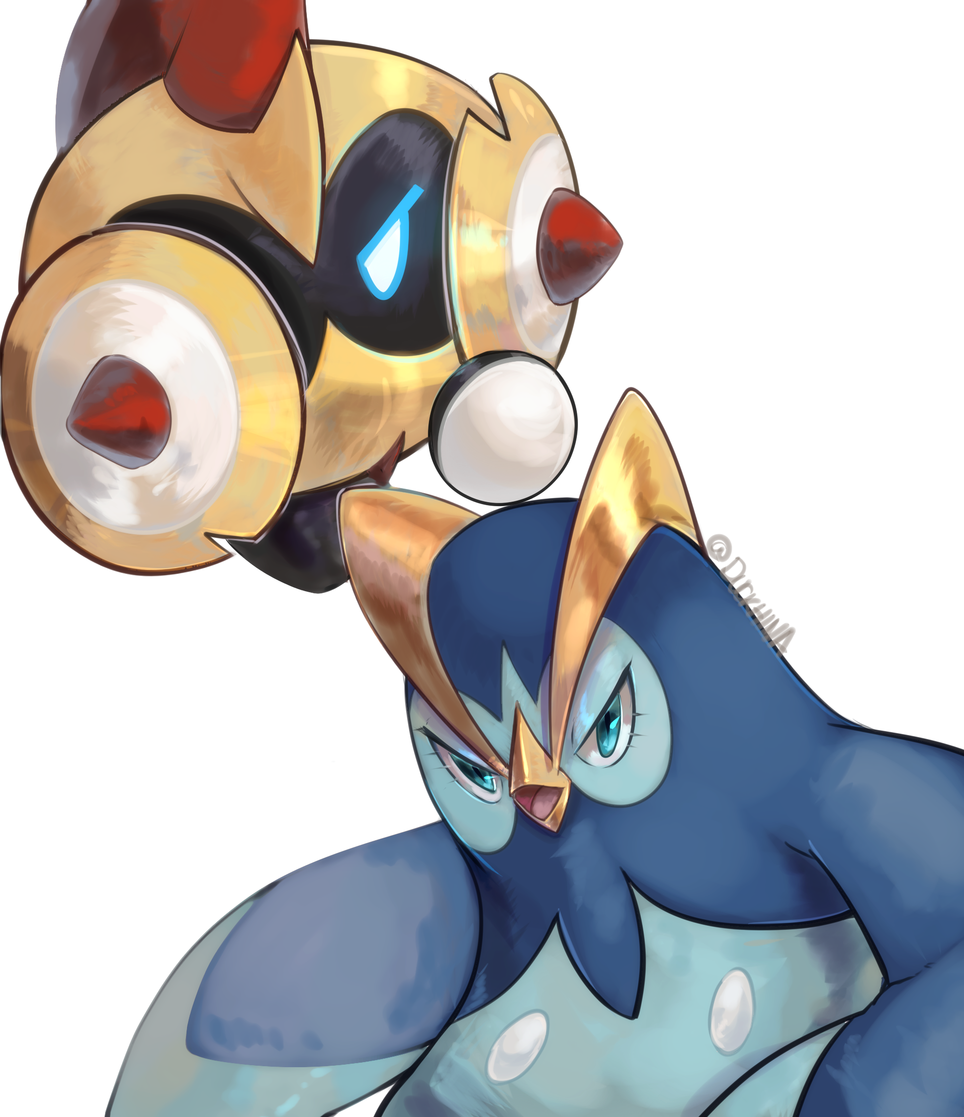 bird blue_eyes commentary duckhina eyelashes falinks gen_4_pokemon gen_8_pokemon green_eyes highres nintendo no_humans open_mouth pokemon pokemon_(creature) prinplup simple_background spikes tongue white_background