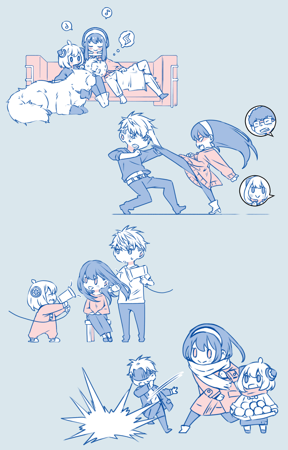 2boys 2girls :> adoptive_parent_and_adoptive_child anya_(spy_x_family) blanket blush bond_(spy_x_family) clenched_teeth commentary_request couch dog dress drunk duel family father_and_child father_and_daughter franky_franklin glasses hair_down hair_dryer hairband hairpods highres husband_and_wife kamimiya kicking lap_pillow limited_palette lying mother_and_child mother_and_daughter multiple_boys multiple_girls on_back parent_and_child scarf shaded_face sidelocks sitting sleeping spy_x_family stool sweatdrop sweater sweater_dress teeth twilight_(spy_x_family) yor_briar
