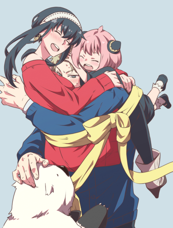 1boy 2girls adoptive_parent_and_adoptive_child anya_(spy_x_family) black_dress blush bond_(spy_x_family) breast_smother child closed_eyes commentary_request dog dress earrings face_to_breasts family father_and_child father_and_daughter hairpods happy hetero hug husband_and_wife jewelry kamimiya long_hair long_sleeves mother_and_child mother_and_daughter multiple_girls off-shoulder_sweater off_shoulder open_mouth pantyhose parent_and_child sidelocks spy_x_family sweatdrop sweater sweater_dress twilight_(spy_x_family) yor_briar