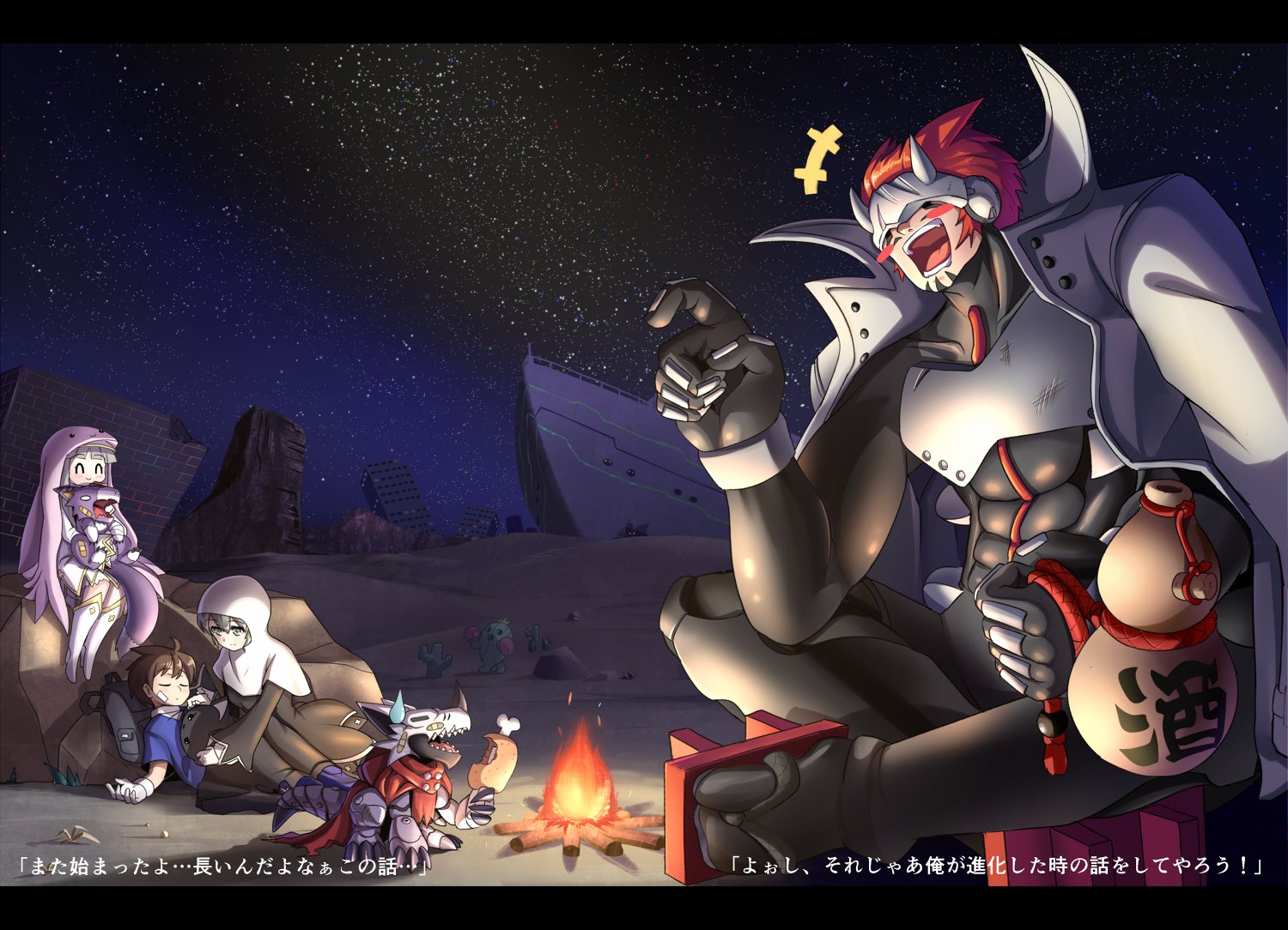 digimon digimon_chronicle dorumon doumoto_kouta food gankoomon hackmon_(digimon) japanese_text mask meat scarf sistermon_blanc sistermon_noir sleeping togemon translation_request