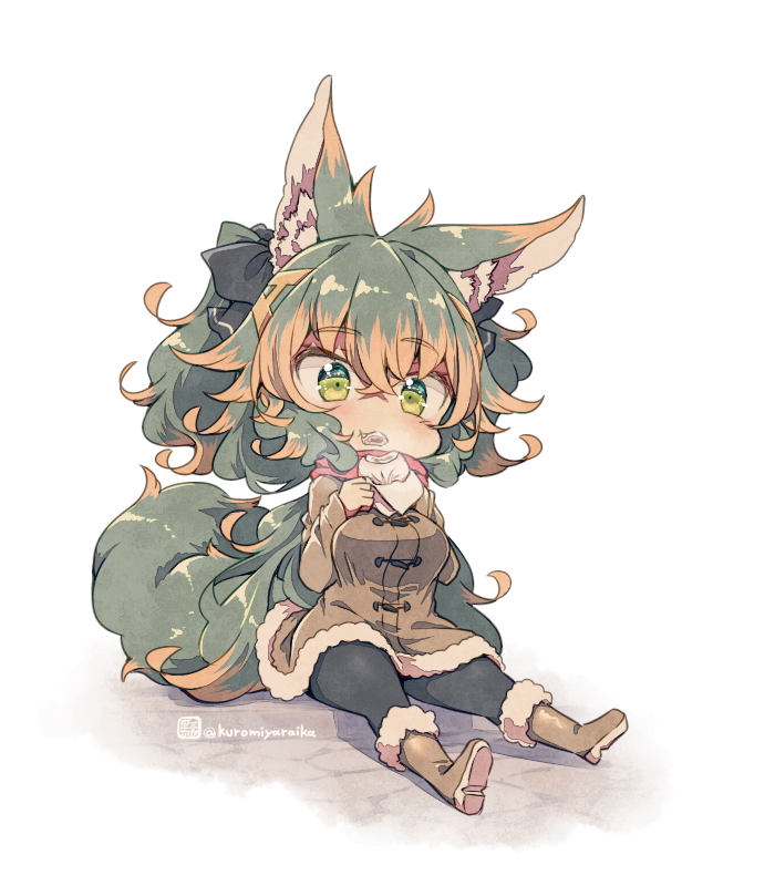 1girl animal_ear_fluff animal_ears black_ribbon boots brown_boots brown_coat coat commentary_request crossed_bangs eating food full_body green_eyes green_hair hair_between_eyes hair_ribbon holding holding_food kuromiya kuromiya_raika_(kuromiya) long_hair multicolored_hair orange_hair original ribbon simple_background sitting solo twitter_username two-tone_hair white_background