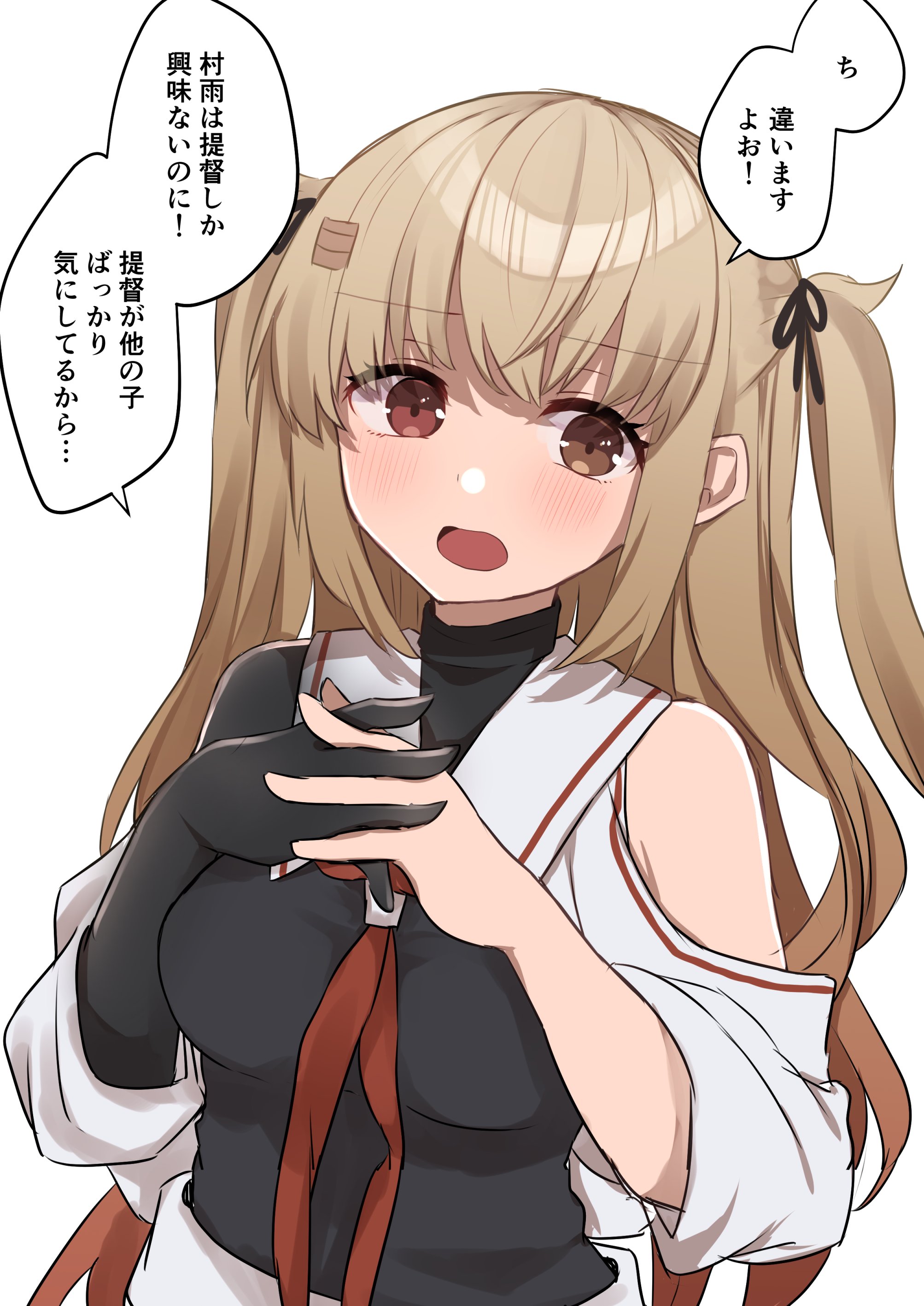 1girl absurdres asymmetrical_clothes black_serafuku brown_eyes gradient_hair heterochromia highres kantai_collection light_brown_hair long_hair looking_at_viewer multicolored_hair murasame_(kancolle) murasame_kai_ni_(kancolle) open_mouth own_hands_clasped own_hands_together red_eyes sailor_collar school_uniform serafuku shirasumato simple_background solo translation_request two_side_up upper_body white_background white_sailor_collar