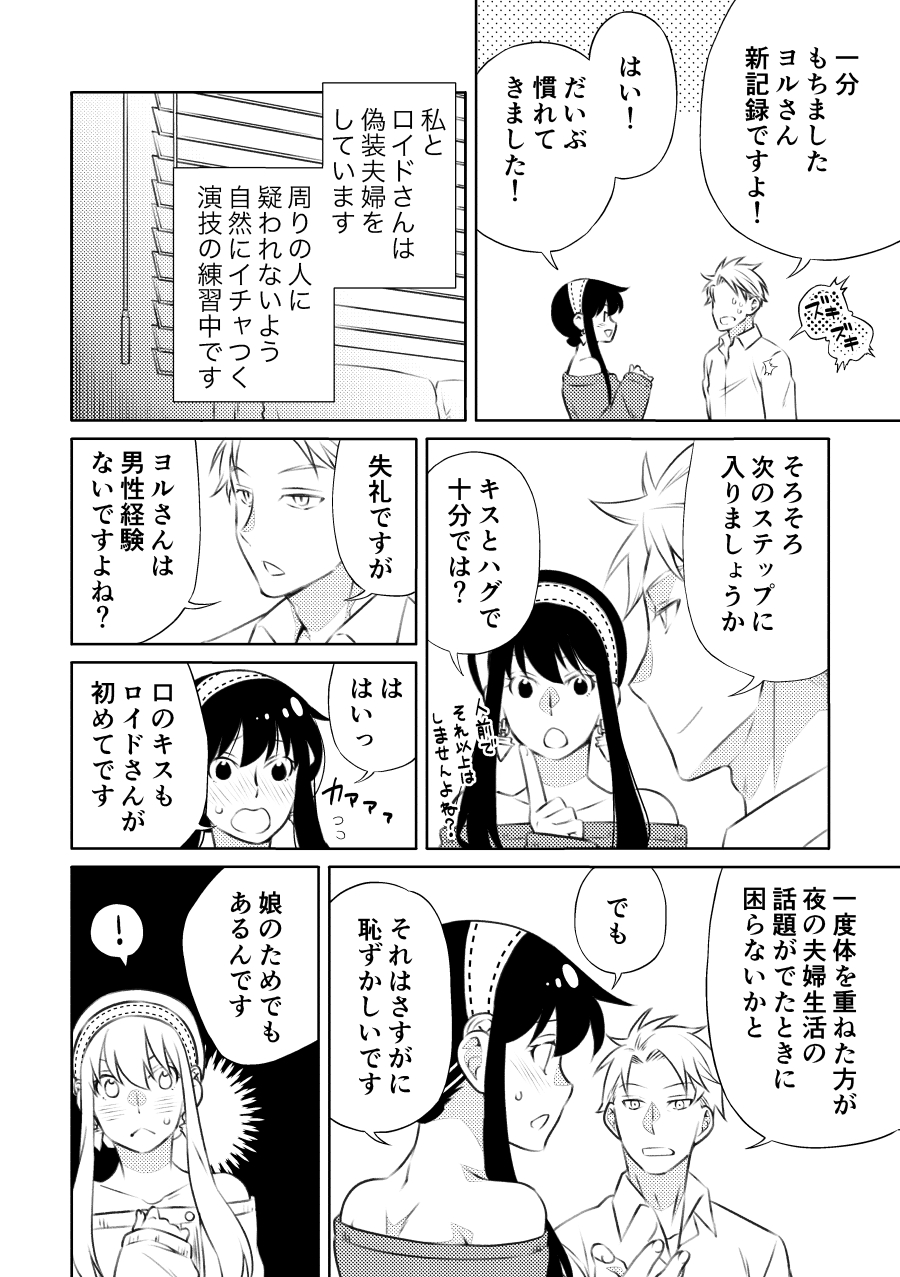 1boy 1girl comic commentary_request dress greyscale hairband highres husband_and_wife index_finger_raised kamimiya long_sleeves monochrome off-shoulder_dress off_shoulder open_mouth sidelocks sleeves_past_wrists smile speech_bubble spy_x_family translation_request twilight_(spy_x_family) window_blinds window_shadow yor_briar