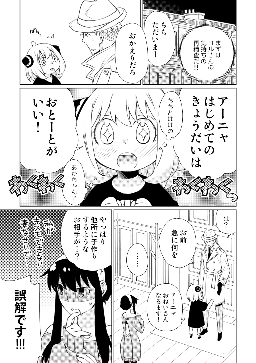 +_+ 1boy 2girls anya_(spy_x_family) bare_shoulders building coat comic door family father_and_child father_and_daughter fedora gloves greyscale hairband hairpods hat highres kamimiya long_sleeves monochrome mother_and_child mother_and_daughter multiple_girls off-shoulder_shirt off_shoulder parent_and_child shaded_face shirt sidelocks sleeves_past_wrists spy_x_family sweatdrop translation_request twilight_(spy_x_family) yor_briar
