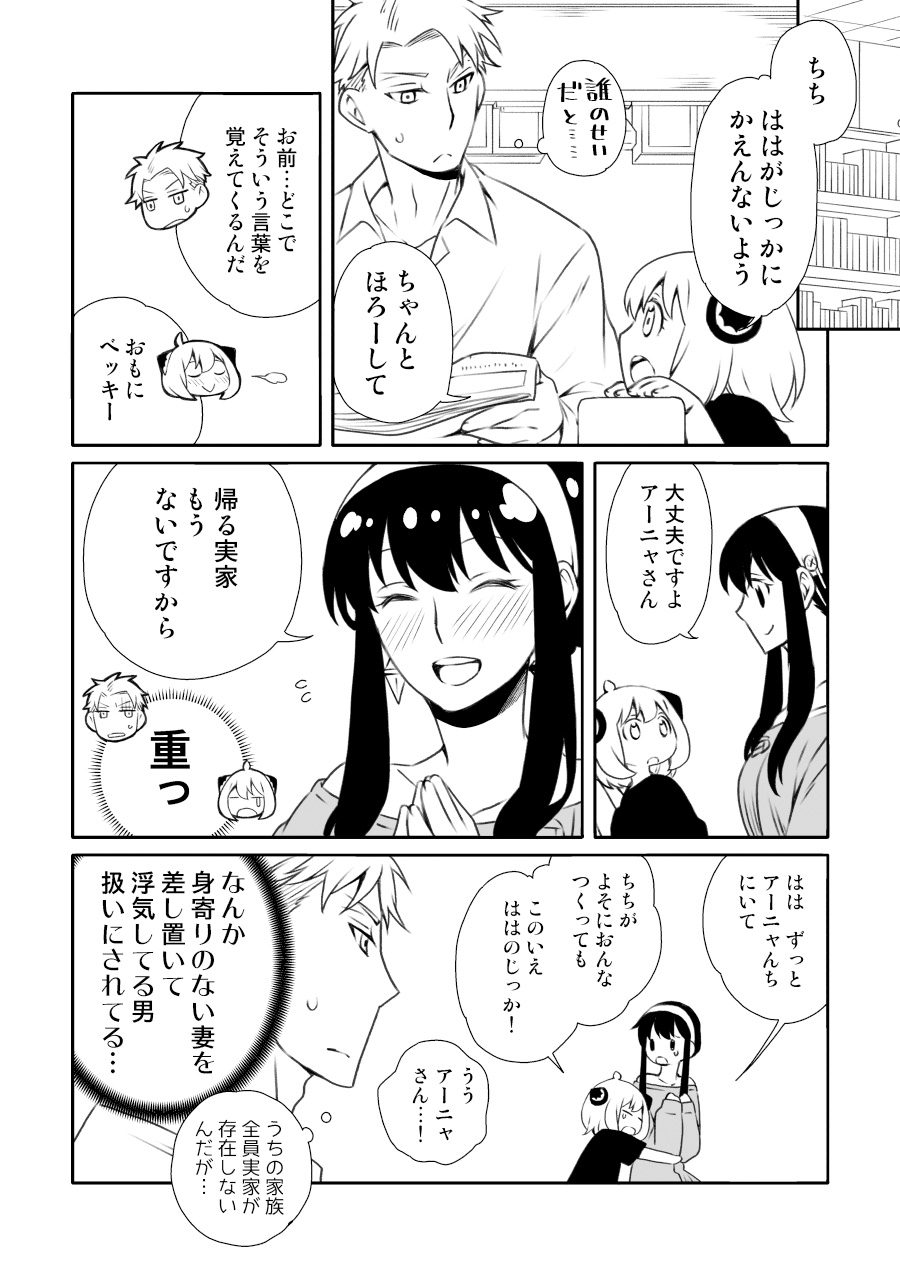 1boy 2girls :> anya_(spy_x_family) bookshelf chibi chibi_inset comic earrings father_and_child father_and_daughter frown greyscale hairband hairpods highres holding holding_newspaper hug husband_and_wife jewelry kamimiya long_sleeves monochrome mother_and_child mother_and_daughter multiple_girls newspaper open_mouth own_hands_together parent_and_child sleeves_past_wrists spy_x_family sweatdrop translation_request twilight_(spy_x_family) yor_briar