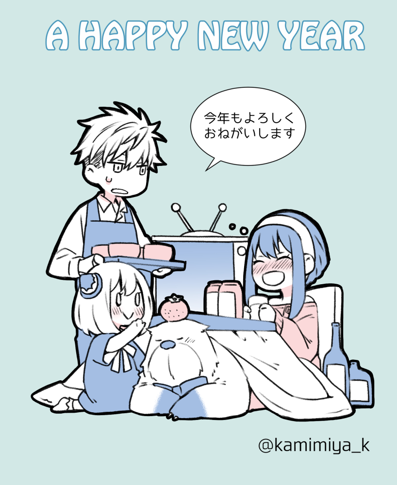 alcohol anya_(spy_x_family) apron beer_bottle beer_can blush bob_cut bond_(spy_x_family) bowl can closed_eyes collared_shirt commentary dog dress drink_can drunk english_text food fruit hair_ornament hairband happy_new_year holding holding_tray kamimiya kotatsu kotoyoro limited_palette long_dress long_sleeves looking_at_another mandarin_orange medium_dress mixed-language_text new_year open_mouth red_dress shirt short_sleeves sidelocks sitting smile spy_x_family squeans standing sweatdrop sweater sweater_dress table television translated tray twilight_(spy_x_family) twitter_username under_kotatsu under_table yor_briar