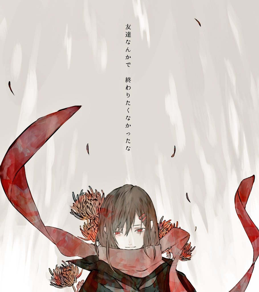 1girl black_sailor_collar black_serafuku brown_hair closed_mouth commentary flower glaring grey_background hair_between_eyes hair_ornament hairclip kagerou_project long_scarf lyrics mekakucity_actors muted_color neckerchief negative_space pale_skin petals red_eyes red_flower red_scarf sailor_collar sailor_collar_lift scarf school_uniform serafuku shirahana_yonoha solo spider_lily straight-on tateyama_ayano translated upper_body wind