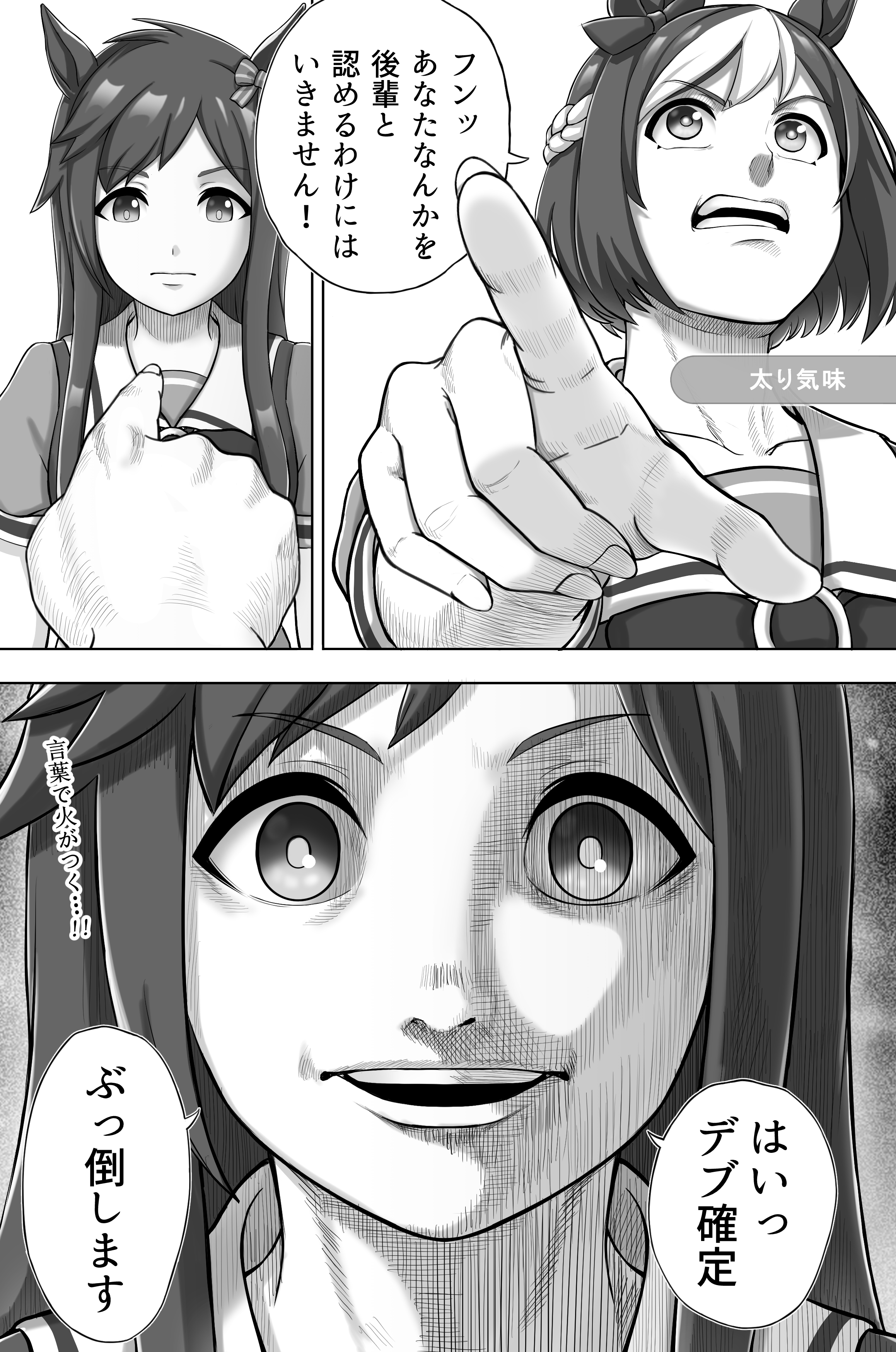 2girls absurdres animal_ears bow braid buena_vista_(old_design)_(umamusume) collarbone comic ear_bow foreshortening french_braid greyscale highres horse_ears horse_girl kantou_rengou koukou_tekken-den_tough long_hair monochrome multiple_girls parody pointing pointing_at_another pov pov_hands puffy_short_sleeves puffy_sleeves sailor_collar sailor_shirt saruwatari_tetsuya_(style) scene_reference school_uniform shirt short_hair short_sleeves sidelocks special_week_(umamusume) speech_bubble style_parody summer_uniform tracen_school_uniform translation_request umamusume