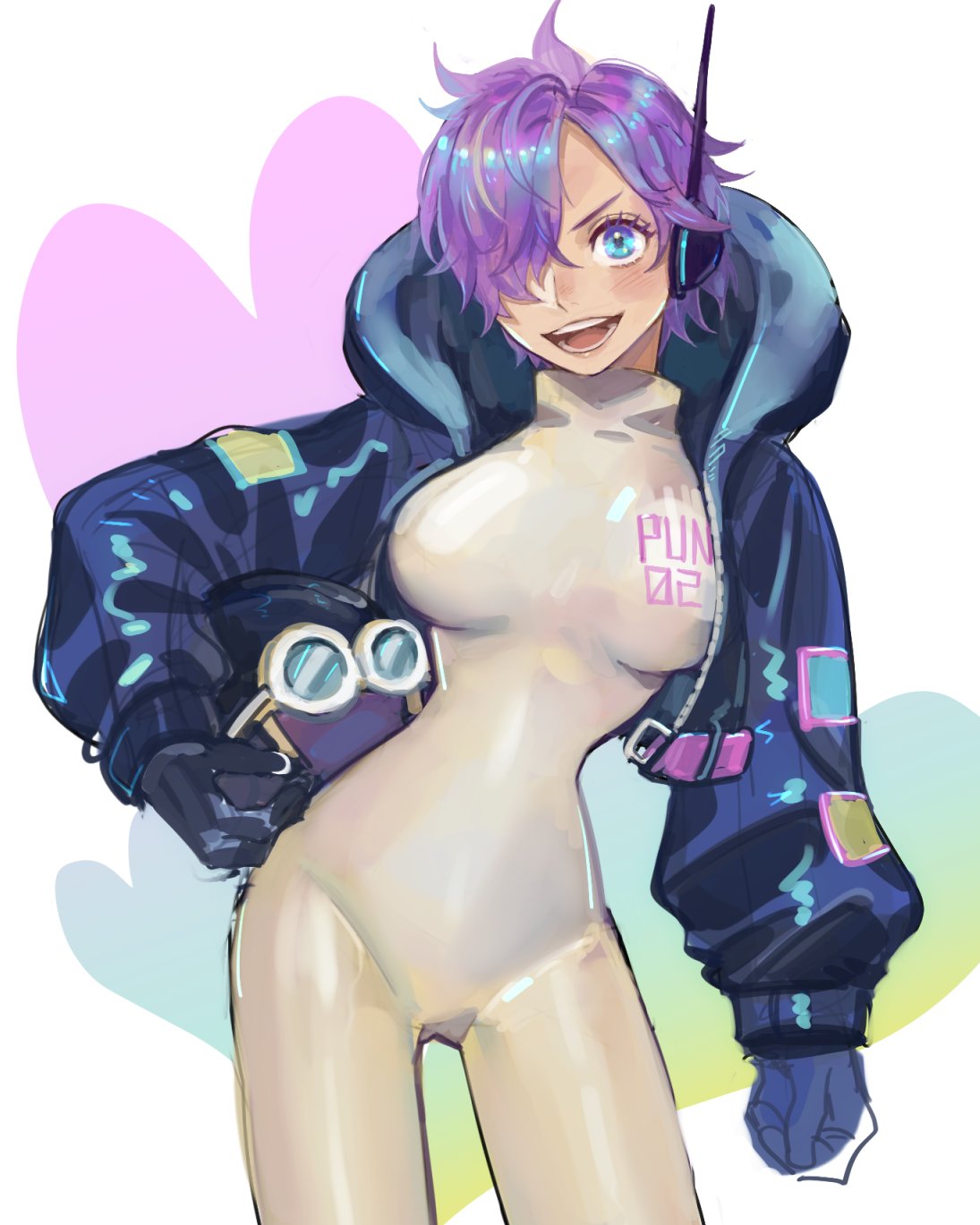 1girl adjusting_clothes bodysuit breasts covered_navel dated eyelashes gloves hair_over_one_eye helmet highres holding holding_unworn_helmet jacket large_breasts lips looking_at_viewer nicoliarts one_piece open_mouth purple_hair short_hair simple_background smile solo thick_thighs thighs unworn_helmet vegapunk_lilith wide_hips