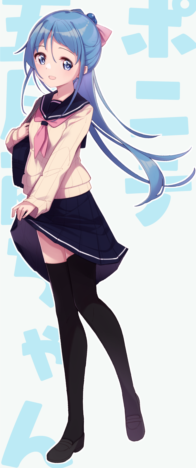 1girl alternate_costume alternate_hairstyle black_sailor_collar black_shoes black_skirt black_thighhighs blue_eyes blue_hair blush clothes_lift full_body hair_between_eyes highres kantai_collection lifting_own_clothes long_hair long_sleeves neckerchief open_mouth pink_neckerchief pleated_skirt ponytail sailor_collar samidare_(kancolle) shoes skirt skirt_lift smile solo text_background thighhighs uut very_long_hair