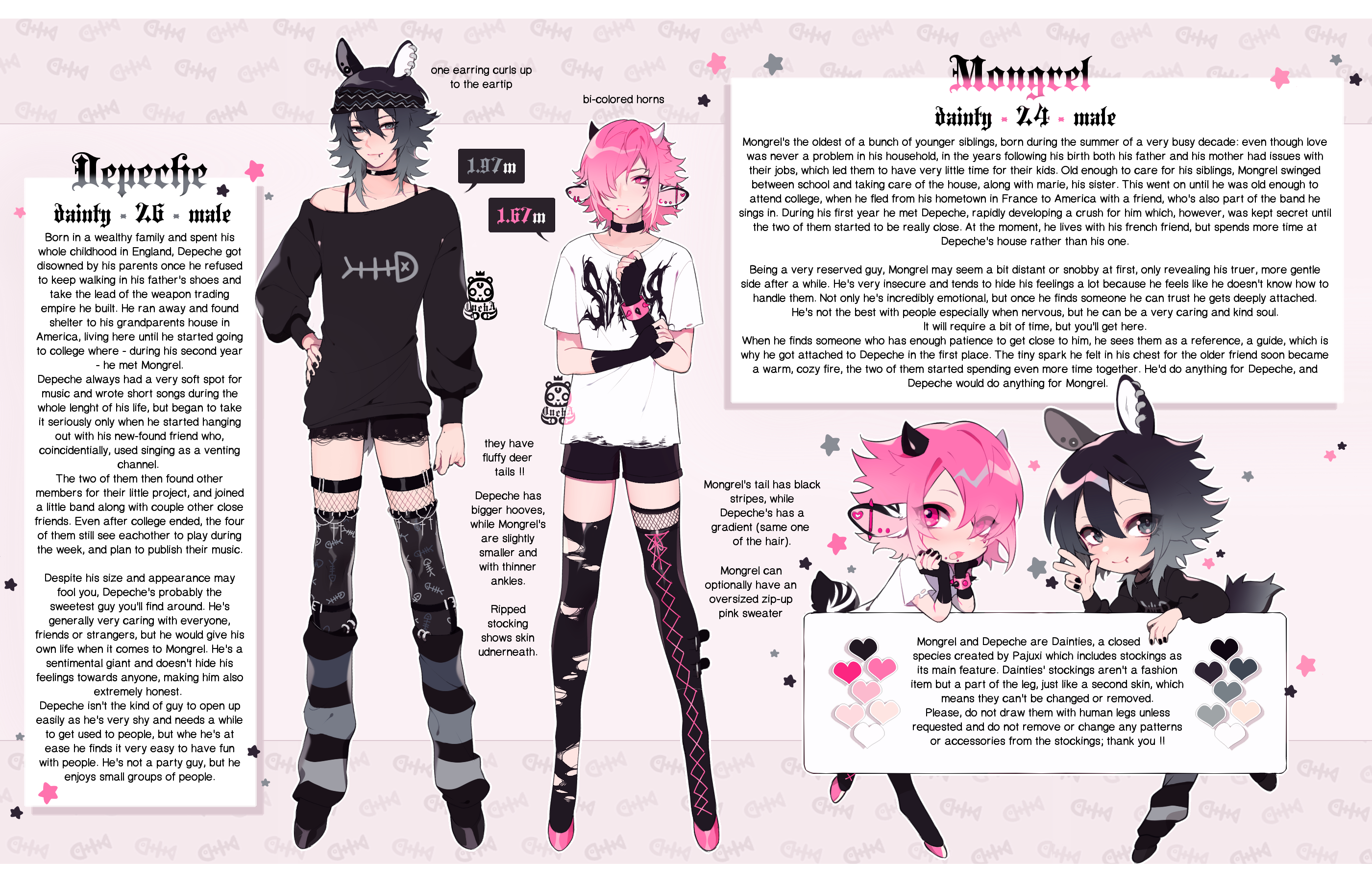 2boys black_hair ear_piercing english_text face_piercing highres horns lip_piercing mazamuno mongrel_(mazamuno) mouth_piercing multiple_boys nail_art original piercing pink_eyes pink_hair pink_nails reference_sheet white_horns yaoi