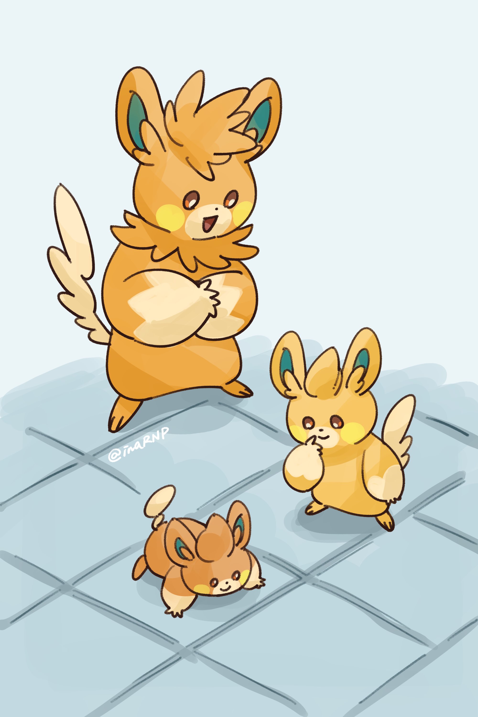 absurdres brown_eyes closed_mouth commentary_request evolutionary_line floor highres inahara looking_at_another looking_down meme nintendo no_humans oh!_pamo-san_(meme) on_floor open_mouth pawmi pawmo pawmot pokemon pokemon_(creature) smile