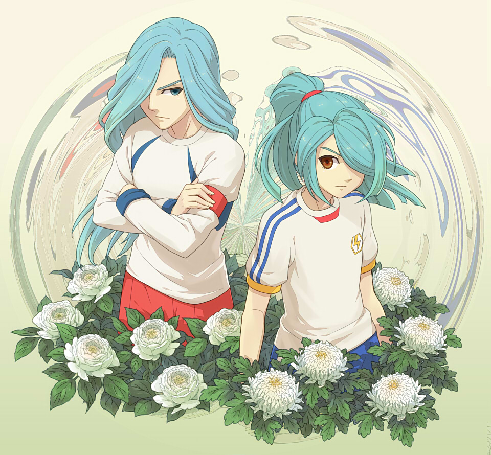 2boys blue_eyes blue_hair brown_eyes chrysanthemum crossed_arms edgar_valtinas flower hair_over_one_eye inazuma_eleven inazuma_eleven_(series) kazemaru_ichirouta long_hair male_focus multiple_boys ponytail short_hair soccer_uniform sportswear yukasummer