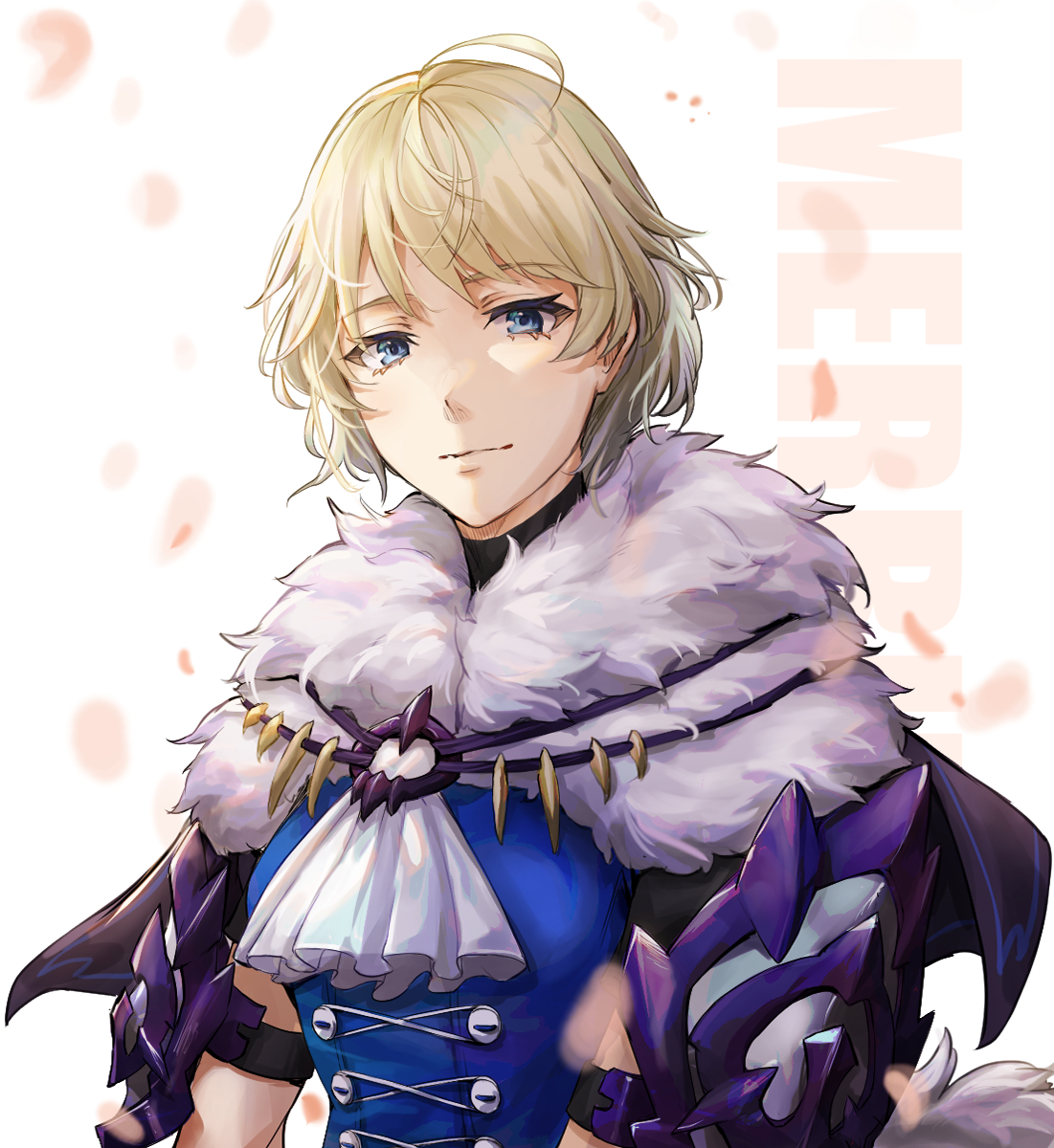 1girl ahoge armor ascot blonde_hair blue_eyes blue_shirt fire_emblem fire_emblem_engage fur_trim highres looking_at_viewer merrin_(fire_emblem) nintendo purple_skirt shirt short_hair simple_background skirt smile solo thigh_strap tomoe0812y