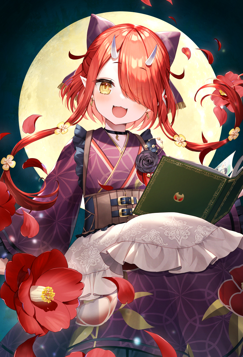 1girl :d apron black_bow book bow commentary_request crescent crescent_earrings earrings fangs flower frilled_apron frilled_sleeves frills fringe_trim full_moon hair_bow hair_over_one_eye hoozuki_warabe horns japanese_clothes jewelry kimono long_hair long_sleeves looking_at_viewer momoshiki_tsubaki moon noripro obi open_book open_mouth petals pointy_ears purple_kimono red_flower red_hair sash smile solo very_long_hair virtual_youtuber waist_apron white_apron wide_sleeves yellow_eyes