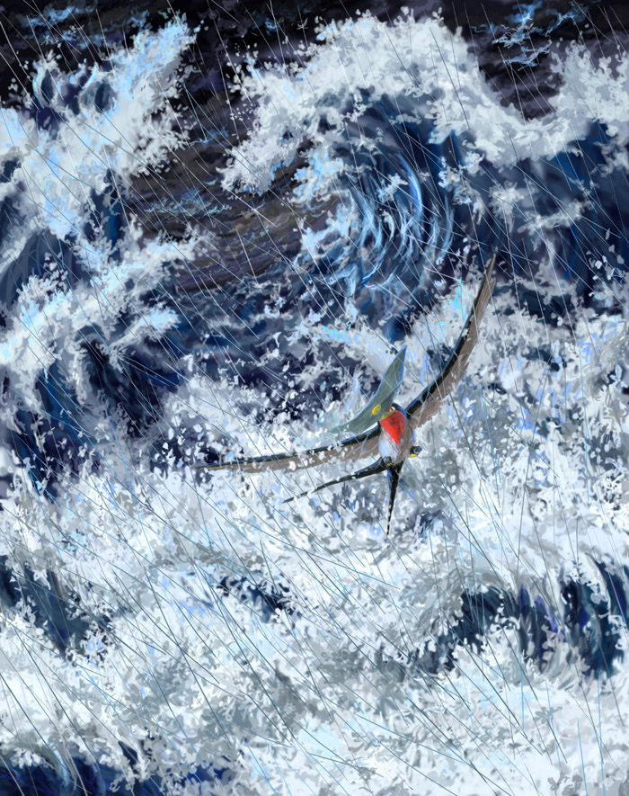 envelope flying gen_3_pokemon letter mail nature night nintendo no.017 no._017 no_humans ocean outdoors pokemon pokemon_(creature) rain scenery storm swellow taillow waves