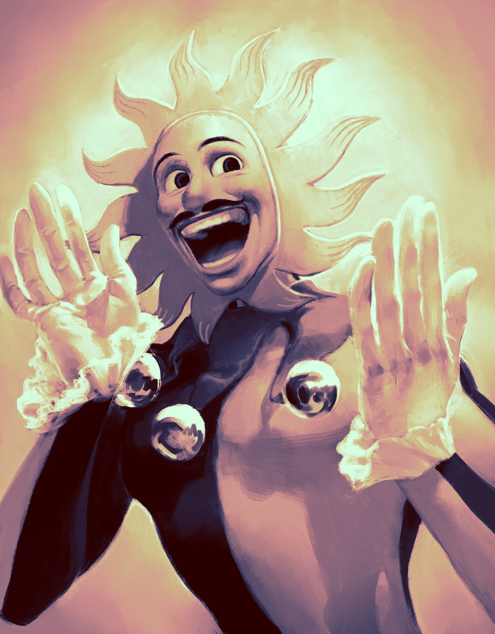 1boy bell black_eyes facial_hair frilled_gloves frills gloves harlequin highres mustache open_mouth papi_(popee_the_performer) popee_the_performer shishinnonoii smile solo_focus sun_costume teeth tongue upper_body white_gloves