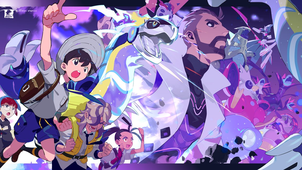 2girls 3boys :o arm_up arven_(pokemon) backpack bag beard belt black_bodysuit black_eyes black_socks bodysuit breast_pocket brown_bag brown_hair clenched_hand closed_mouth coat e_volution facial_hair florian_(pokemon) glasses gloves grey_headwear grey_shirt hat index_finger_raised iron_bundle iron_hands_(pokemon) iron_jugulis iron_moth iron_thorns iron_treads miraidon multiple_boys multiple_girls necktie nemona_(pokemon) nintendo open_mouth penny_(pokemon) pocket pokemon pokemon_(creature) pokemon_scarlet_and_violet ponytail red_hair round_eyewear shirt shoes short_hair short_sleeves shorts single_glove socks teeth professor_turo upper_teeth_only vest white_coat yellow_vest