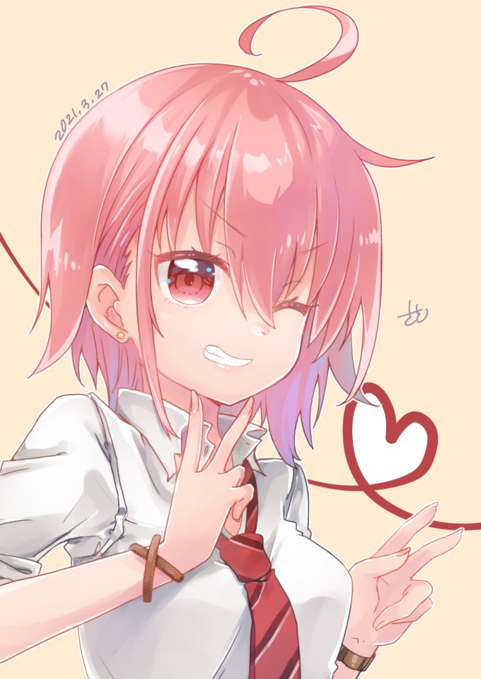 1girl ahoge double_v earrings fudou_yukimitsu_(tenka_hyakken) heart jewelry loose_necktie necktie one_eye_closed open_collar pink_eyes pink_hair shirt short_hair short_sleeves smile ssk_sasasa teeth tenka_hyakken v v-shaped_eyebrows white_shirt wristband