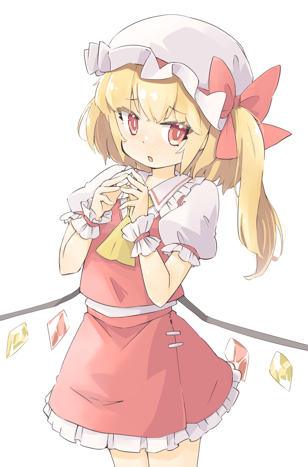 1girl :o arnest ascot blonde_hair blush bow bright_pupils chestnut_mouth collared_shirt cowboy_shot crystal dot_nose eyes_visible_through_hair flandre_scarlet flustered frilled_shirt_collar frilled_sleeves frills furrowed_brow hands_up hat hat_bow hat_ribbon highres long_hair looking_at_viewer looking_to_the_side low_wings mob_cap own_hands_together parted_lips petticoat puffy_short_sleeves puffy_sleeves red_bow red_eyes red_ribbon red_skirt red_vest ribbon shirt shirt_tucked_in short_sleeves shy side_ponytail simple_background skirt skirt_set solo standing steepled_fingers thick_eyelashes touhou vest w_arms white_background white_hat white_pupils white_shirt wing_collar wings wrist_cuffs yellow_ascot