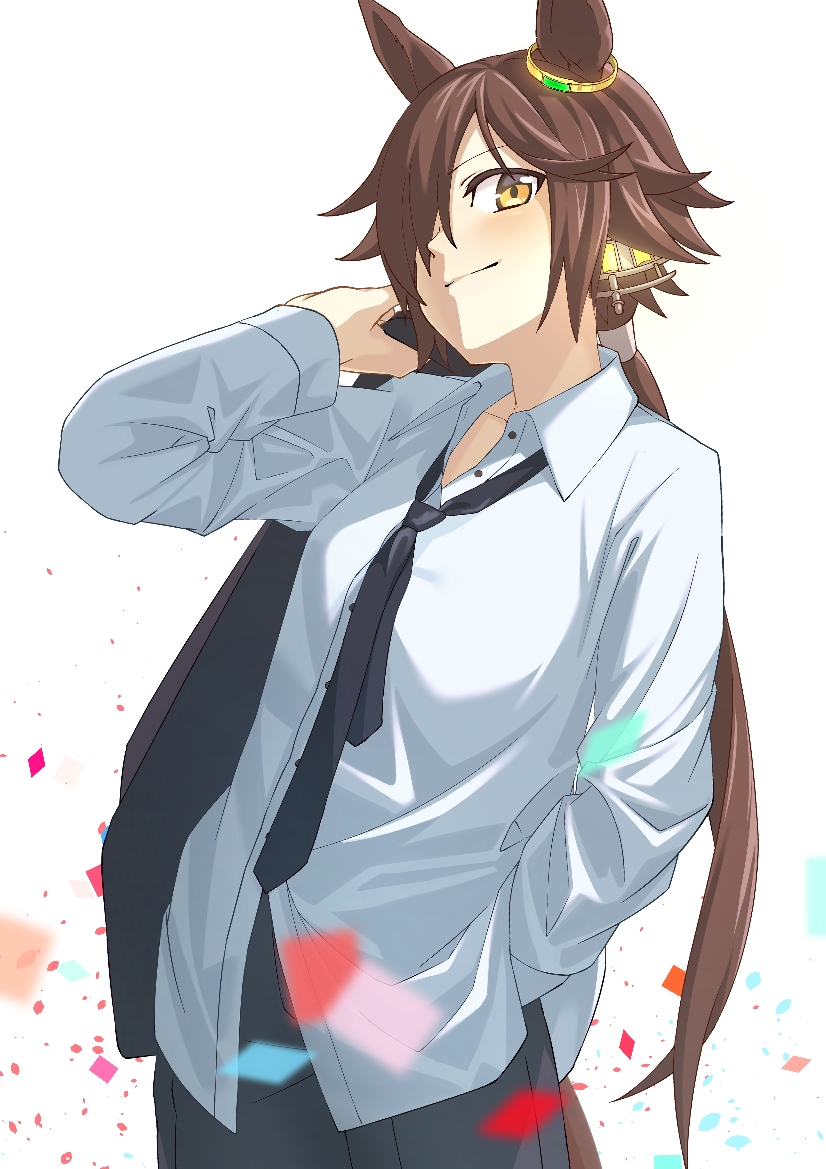 1girl alcohol animal_ears black_jacket black_necktie black_pants collared_shirt confetti cosplay etta-chan formal_clothes hair_over_one_eye hand_in_pocket holding holding_jacket holding_unworn_clothes horse_ears horse_girl horse_tail jacket jacket_over_shoulder long_bangs long_hair long_sleeves meitantei_conan name_connection necktie pants ponytail shirt simple_background smile solo tail umamusume unworn_jacket vodka vodka_(meitantei_conan) vodka_(meitantei_conan)_(cosplay) vodka_(umamusume) white_background white_shirt