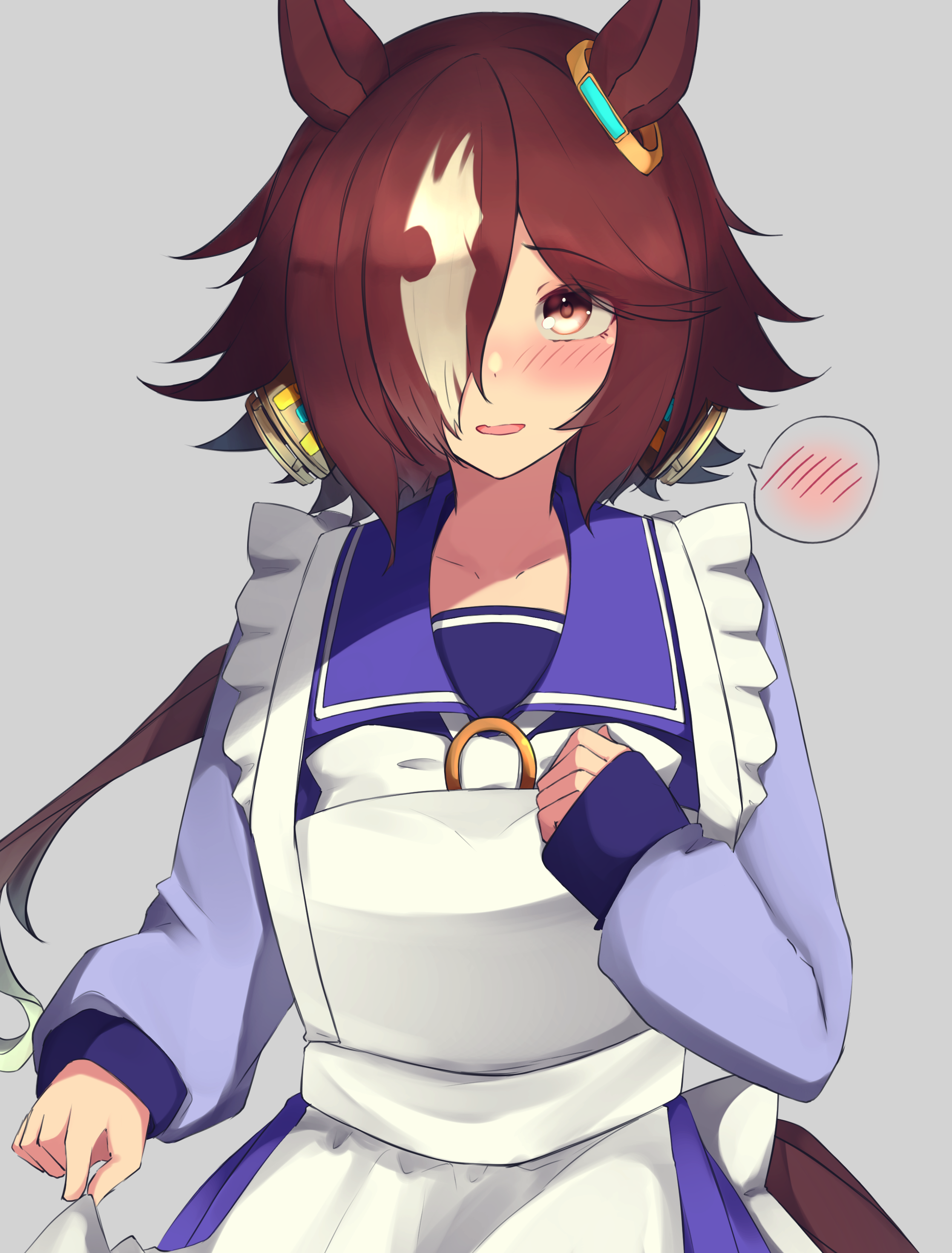 1girl :d absurdres animal_ears apron bow bowtie brown_eyes brown_hair frilled_apron frills hair_over_one_eye highres horse_ears horse_girl horse_tail long_hair long_sleeves looking_at_viewer mountain_yasan open_mouth ponytail purple_shirt purple_skirt sailor_collar school_uniform serafuku shirt simple_background skirt smile solo spoken_blush tail tracen_school_uniform umamusume upper_body vodka_(umamusume) white_apron white_background white_bow white_bowtie