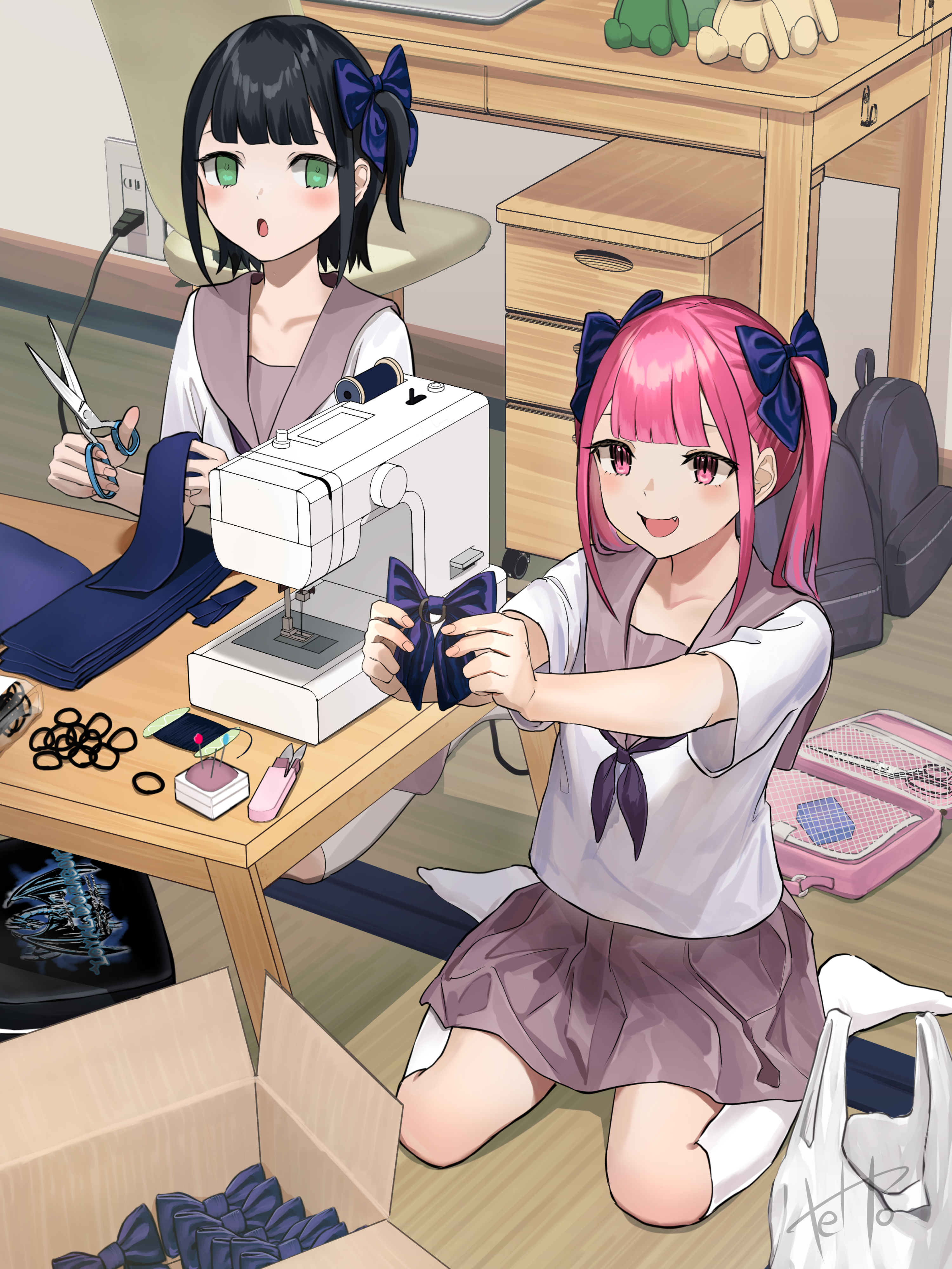 2girls :d :o absurdres backpack bag black_hair blush bow brown_skirt douryou_(buta5813) electrical_outlet full_body green_eyes highres hinamizawa_hinami_(tetto) indoors miniskirt multiple_girls no_shoes open_mouth original pincushion pink_eyes pink_hair school_uniform scissors serafuku sewing sewing_machine shirt short_sleeves sitting skirt slice_of_life smile socks tetto_(onnoveltet) wariza white_shirt white_socks