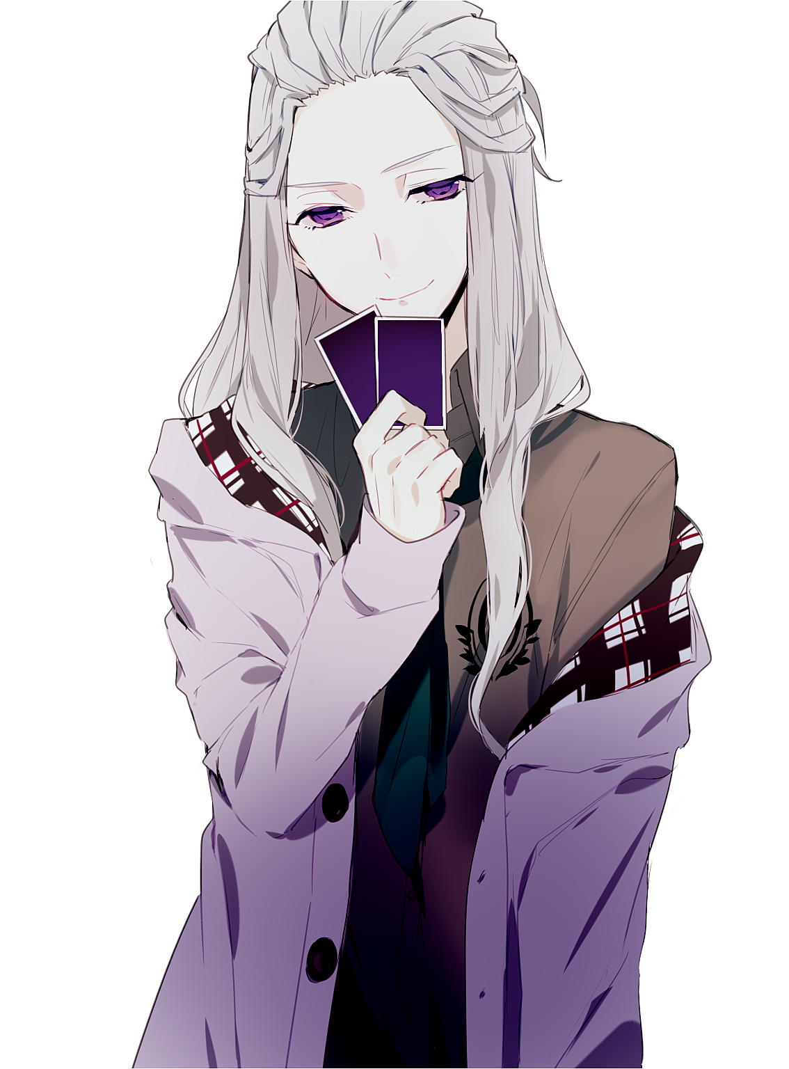 1boy blue_necktie card charade_maniacs closed_mouth coat coat_partially_removed grey_hair grey_shirt gyoubu_souta highres long_hair long_sleeves looking_at_viewer male_focus necktie purple_coat purple_eyes qi7pi shirt smile solo