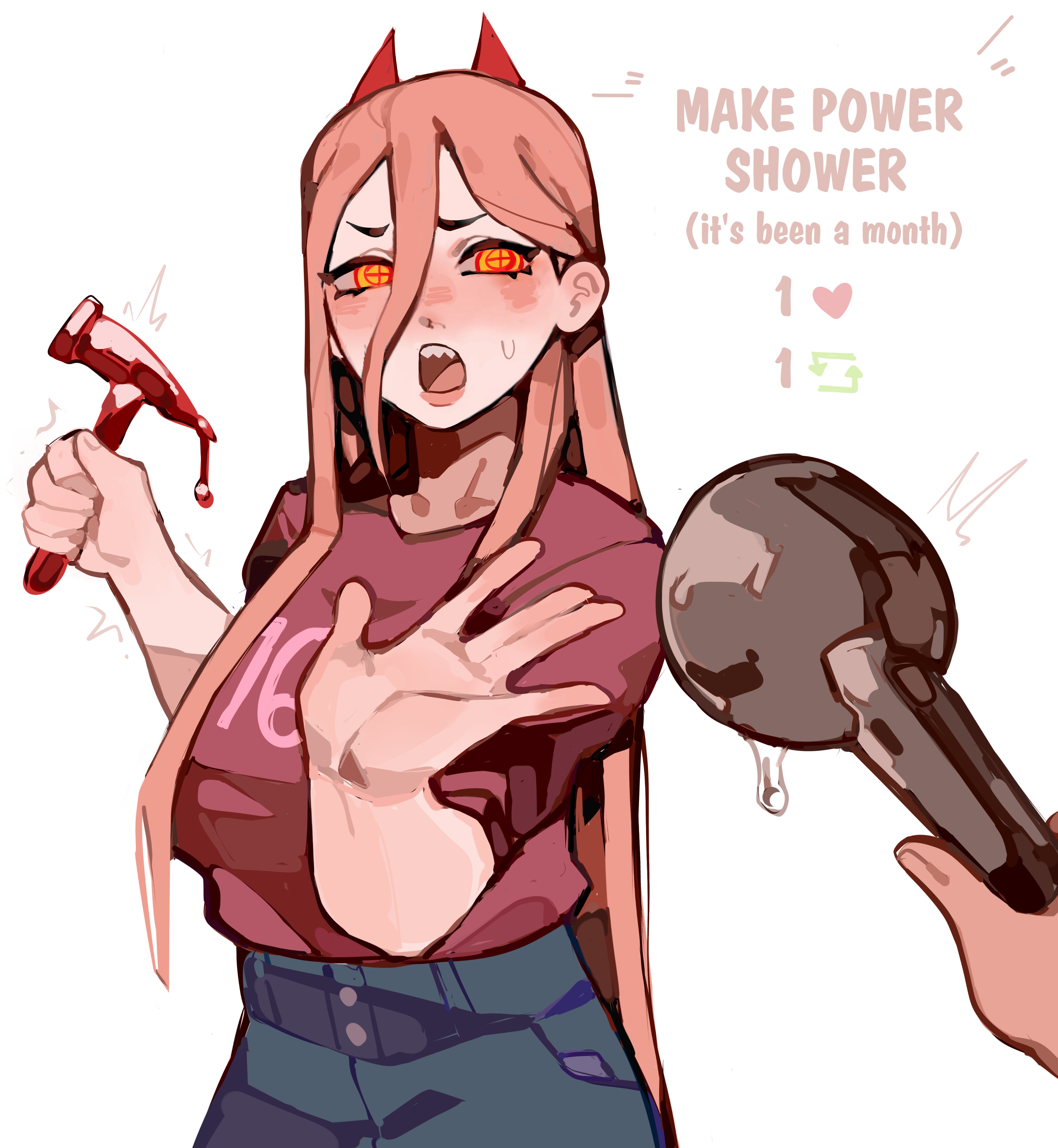 1girl absurdres blood blood_drip blush brown_hair chainsaw_man cross-shaped_pupils english_text hair_between_eyes hair_over_shoulder hammer highres holding holding_hammer holding_shower_head horns long_hair looking_at_viewer maggoo open_mouth pink_shirt power_(chainsaw_man) red_horns sharp_teeth shirt shirt_tucked_in shower_head simple_background sweatdrop symbol-shaped_pupils teeth twitter_strip_game white_background yellow_eyes