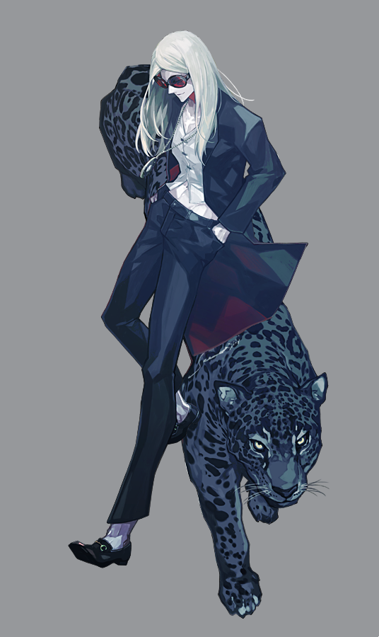 1boy animal blonde_hair fate/grand_order fate_(series) full_body hands_in_pockets jaguar jewelry long_hair necklace sei_8220 simple_background sunglasses tezcatlipoca_(fate) tezcatlipoca_(first_ascension)_(fate)
