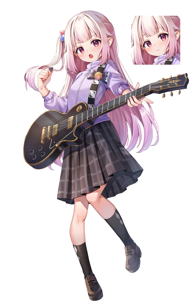 1girl :o black_skirt black_socks brown_footwear chucolala chyoling closed_mouth commentary_request cube_hair_ornament electric_guitar full_body grey_hair guitar hair_ornament holding holding_instrument instrument jacket loafers long_hair long_sleeves mashiro_kanon multiple_views official_art one_side_up open_mouth pleated_skirt plectrum pointy_ears puffy_long_sleeves puffy_sleeves purple_jacket red_eyes school_uniform shoes skirt socks standing standing_on_one_leg track_jacket v-shaped_eyebrows very_long_hair virtual_youtuber
