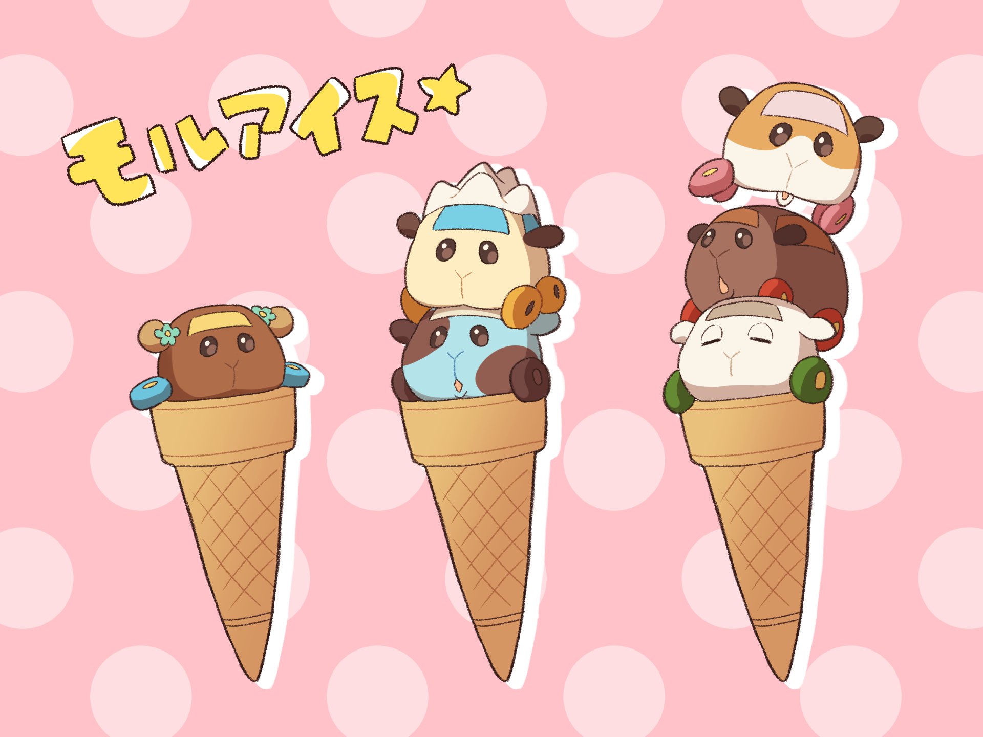 abbey_(pui_pui_molcar) animal_focus choco_(pui_pui_molcar) chocomint_(pui_pui_molcar) closed_eyes closed_mouth commentary_request flower food full_body green_flower guinea_pig highres ice_cream ice_cream_cone kani_aruki_(aruki_kanikani) molcar no_humans open_mouth pink_background polka_dot polka_dot_background potato_(pui_pui_molcar) pui_pui_molcar shiromo_(pui_pui_molcar) simple_background stack star_(symbol) teddy_(pui_pui_molcar) translation_request
