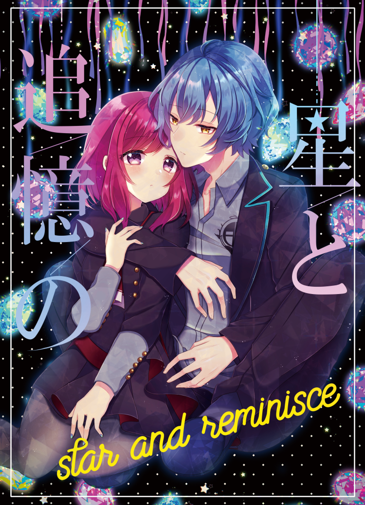 1boy 1girl ahoge black_background black_jacket black_pants black_skirt blazer blue_hair blush charade_maniacs closed_mouth comic_cover haizi_takumi hetero hug jacket kakyoxx long_sleeves orange_eyes pants purple_eyes red_hair sena_hiyori sitting skirt