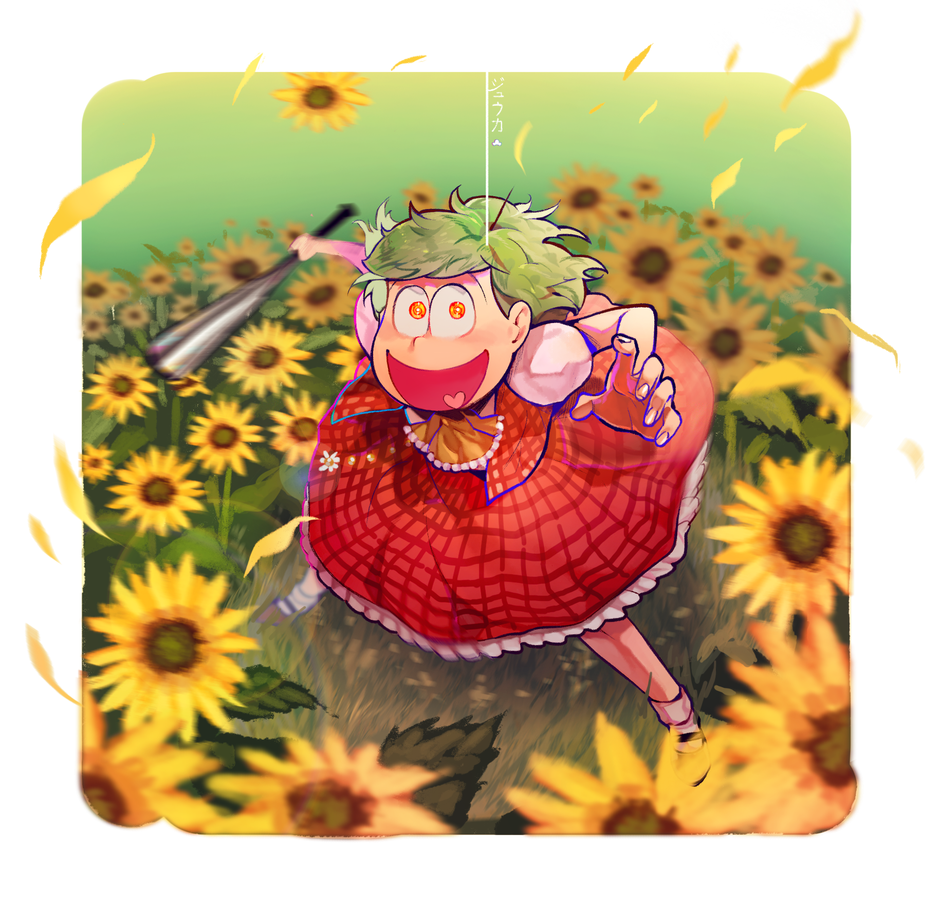 176feet ascot baseball_bat collared_shirt cosplay crossdressing field flower flower_field frilled_skirt frills green_hair heart heart_in_mouth highres incoming_attack kazami_yuuka kazami_yuuka_(cosplay) long_skirt long_sleeves male_focus matsuno_jyushimatsu metal_baseball_bat osomatsu-san osomatsu_(series) plaid_clothes plaid_skirt plaid_vest reaching reaching_towards_viewer red_skirt red_vest shirt short_hair skirt skirt_set smile socks sunflower sunflower_field vest wavy_hair white_shirt yellow_ascot yellow_eyes