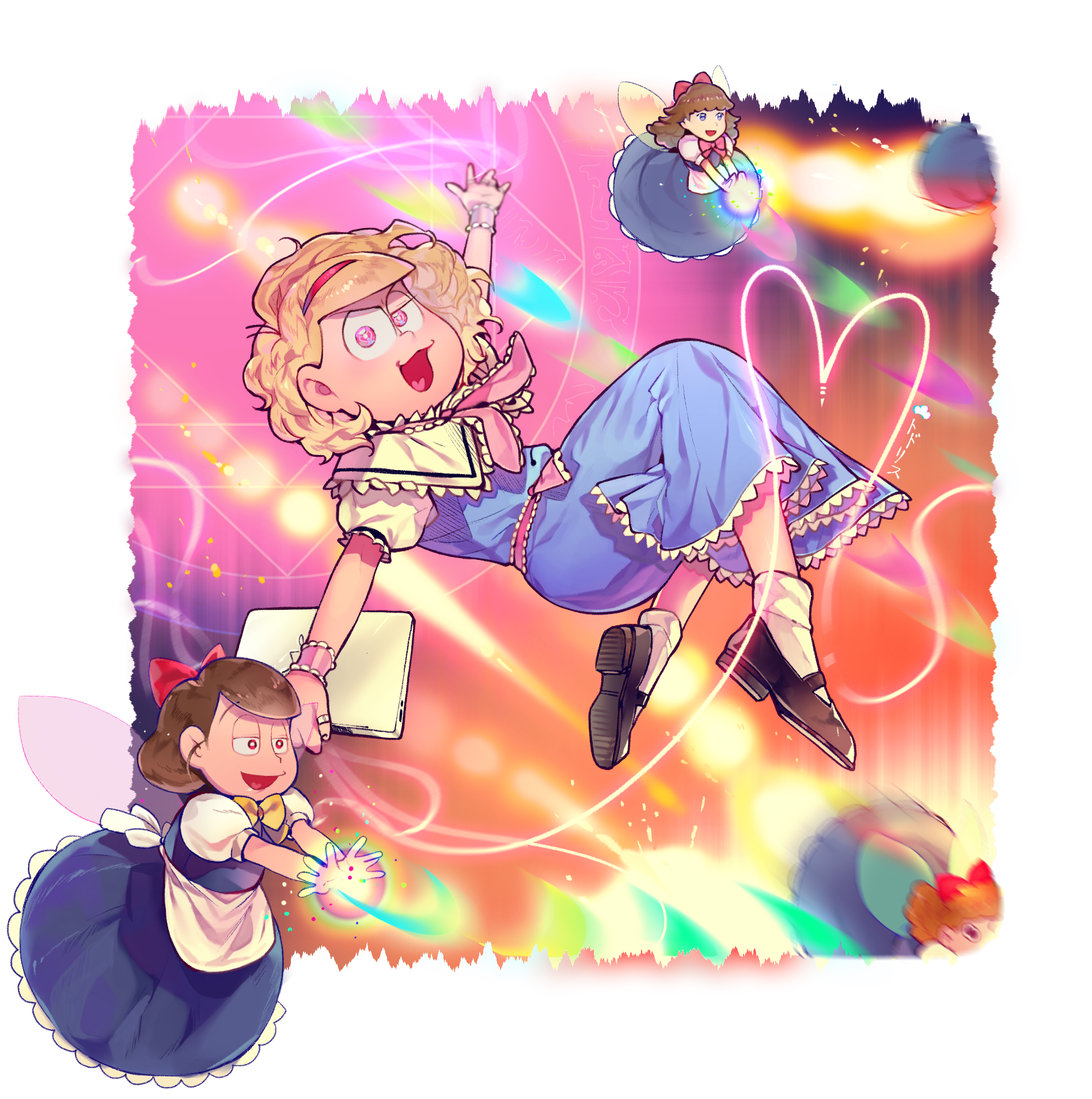 176feet :3 aida_(osomatsu-san) alice_margatroid alice_margatroid_(cosplay) ascot atsushi_(osomatsu-san) blonde_hair blue_dress bow brown_footwear capelet cosplay crossdressing doll dress frilled_ascot frilled_dress frills hair_bow hairband highres hourai_doll hourai_doll_(cosplay) jitome looking_at_viewer male_focus matsuno_todomatsu medium_hair osomatsu-san osomatsu_(series) pink_ascot pink_eyes puffy_short_sleeves puffy_sleeves red_dress red_hairband sachiko_(osomatsu-san) short_sleeves spell_card touhou uneven_eyes white_capelet yellow_bow