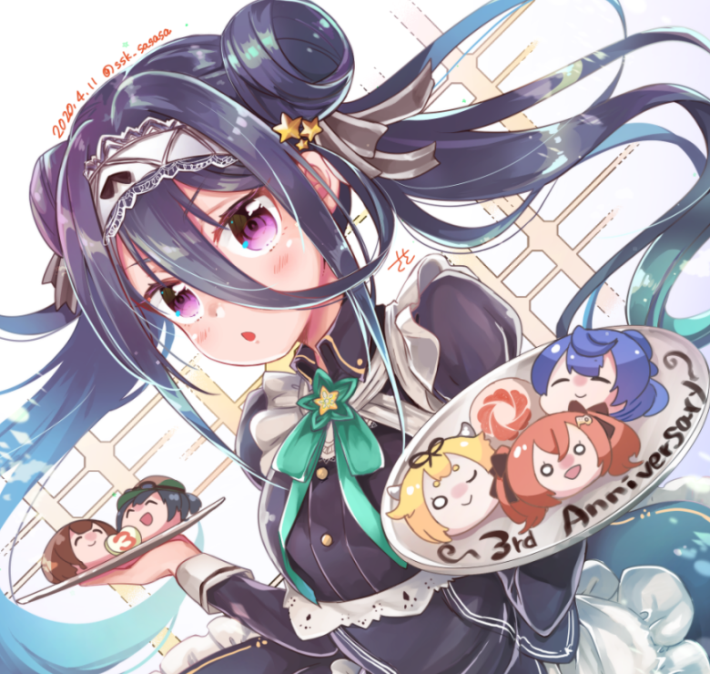 anniversary apron black_hair blush bow bowtie collared_dress double_bun dress food frills goou_yoshimitsu hair_bun hair_ribbon holding holding_plate jouizumi_masamune kuwana_gou_(tenka_hyakken) long_hair long_sleeves maid_apron maid_headdress nanaka_(tenka_hyakken) parted_lips plate puffy_long_sleeves puffy_sleeves purple_eyes ribbon shichiseiken_(tenka_hyakken) ssk_sasasa star_(symbol) sweets tenka_hyakken twintails v-shaped_eyebrows yayoi_(tenka_hyakken)