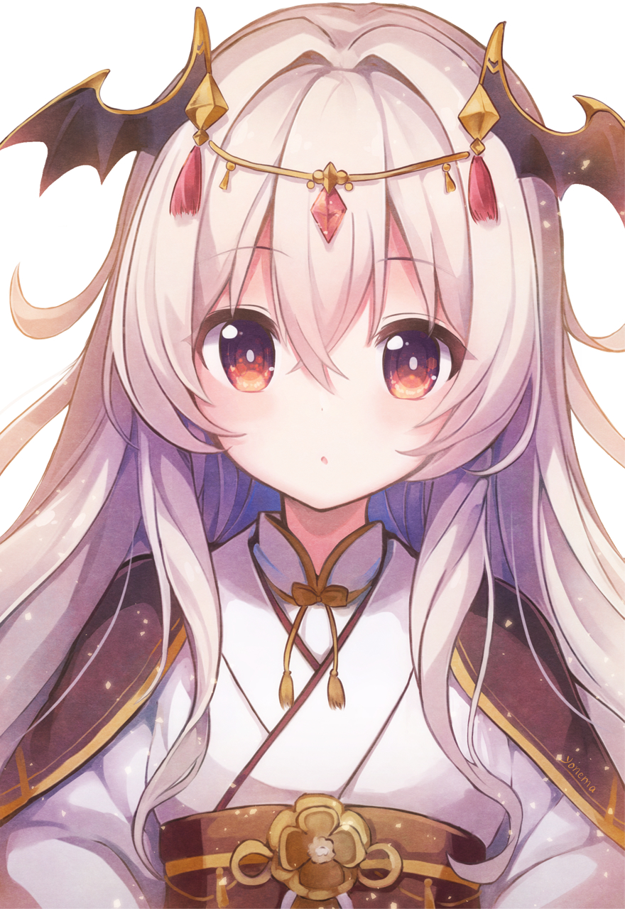 1girl :o bat_wings black_wings commentary_request grey_hair hair_between_eyes hair_intakes head_wings highres japanese_clothes kimono long_hair looking_at_viewer obi original parted_lips red_eyes sash simple_background solo upper_body white_background white_kimono wings yonema