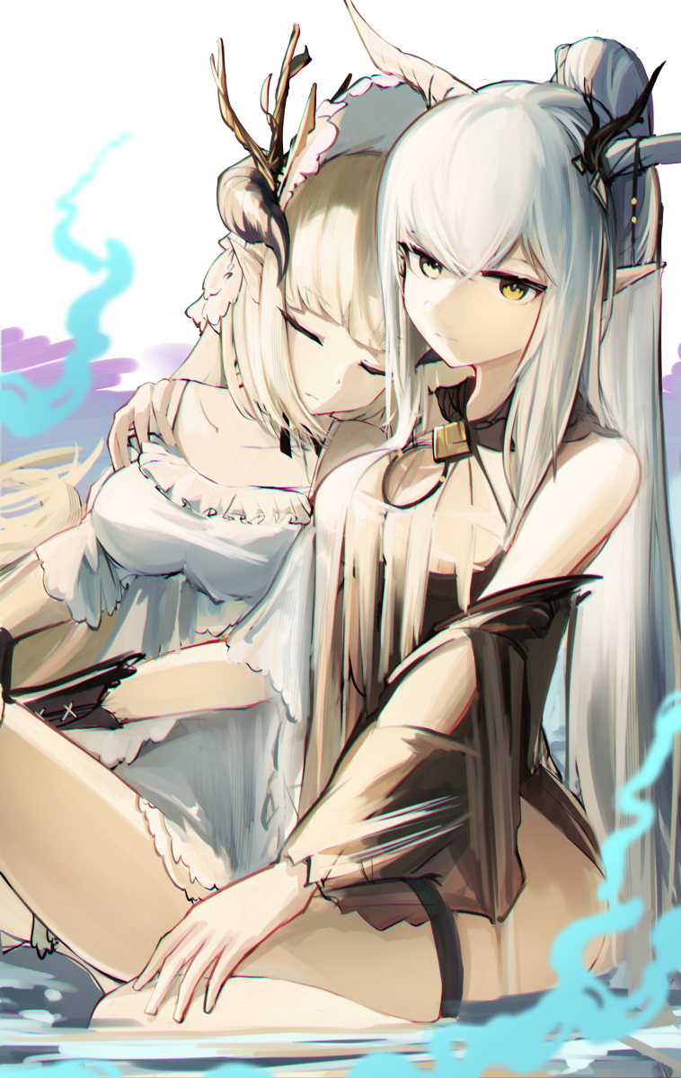 2girls arknights blonde_hair closed_eyes demon_horns dress highres horns long_hair mizuhashi_parusui multiple_girls nightingale_(arknights) shining_(arknights) shining_(silent_night)_(arknights) sleeping white_dress white_hair yellow_eyes yuri