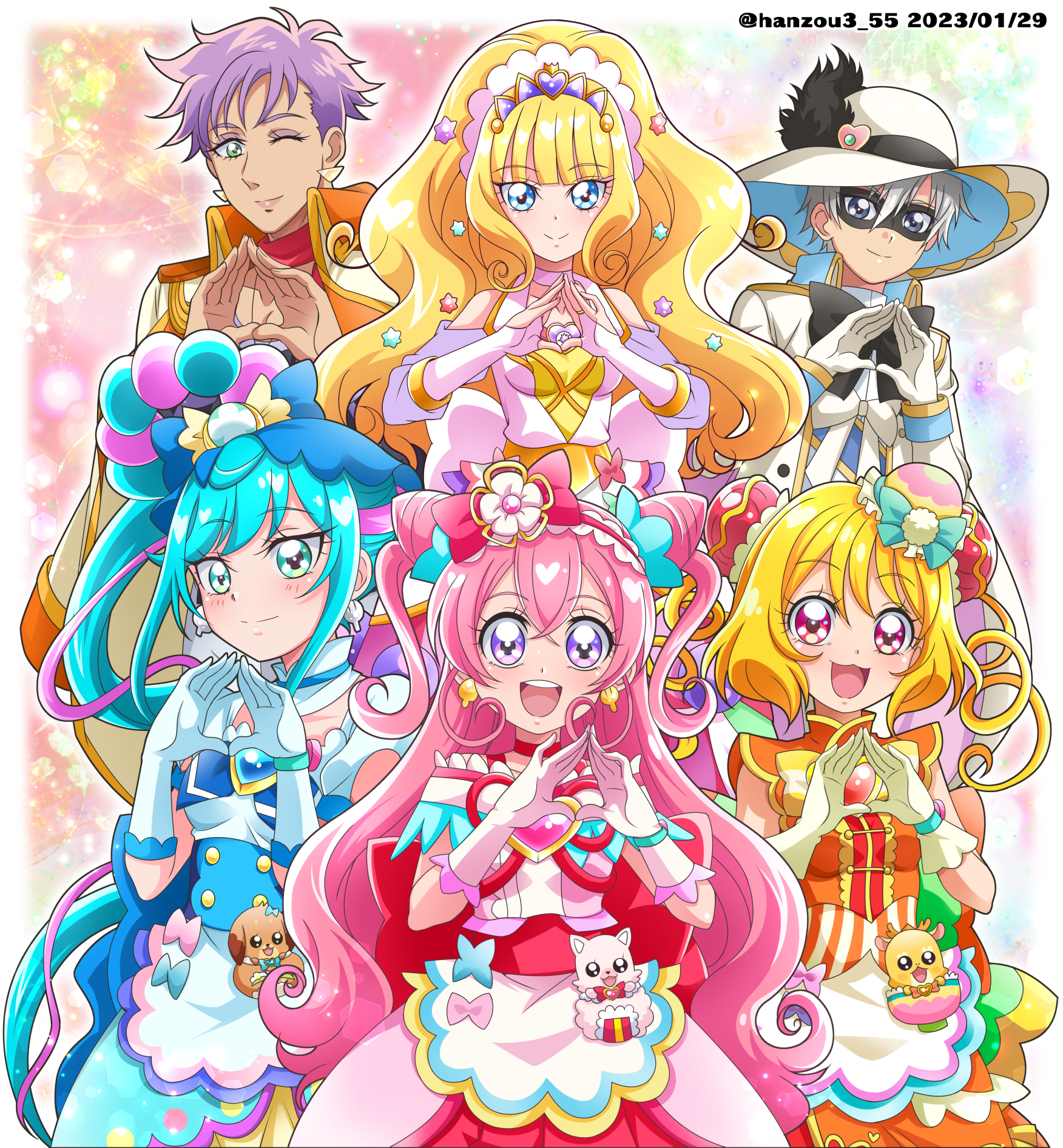 2boys 4girls :d apron back_bow big_hair black_bow black_pepper_(precure) blonde_hair blue_bow blue_dress blue_eyes blue_gloves blue_hair blunt_bangs bob_cut bow bridal_gauntlets bun_cover china_dress chinese_clothes choker closed_mouth clothing_cutout cone_hair_bun cure_finale cure_precious cure_spicy cure_yum-yum dark-skinned_male dark_skin dated delicious_party_precure domino_mask double_bun dress earrings eye_mask fuwa_kokone gloves green_eyes grey_hair hair_bun hair_ornament hair_rings hairband hanamichi_ran hanzou hat hat_feather heart highres jacket jacket_on_shoulders jewelry kasai_amane kome-kome long_hair mask mem-mem_(precure) multiple_boys multiple_girls nagomi_yui one_eye_closed open_mouth orange_bow orange_dress own_hands_together pam-pam pink_bow pink_dress pink_gloves pink_hair precure purple_dress purple_eyes purple_hair red_bow red_choker red_eyes red_hairband rosemary_(precure) shinada_takumi short_hair short_sleeves shoulder_cutout side_ponytail single_hair_ring smile sun_hat tiara twitter_username two_side_up very_long_hair waist_apron white_choker white_gloves white_headwear white_jacket yellow_gloves