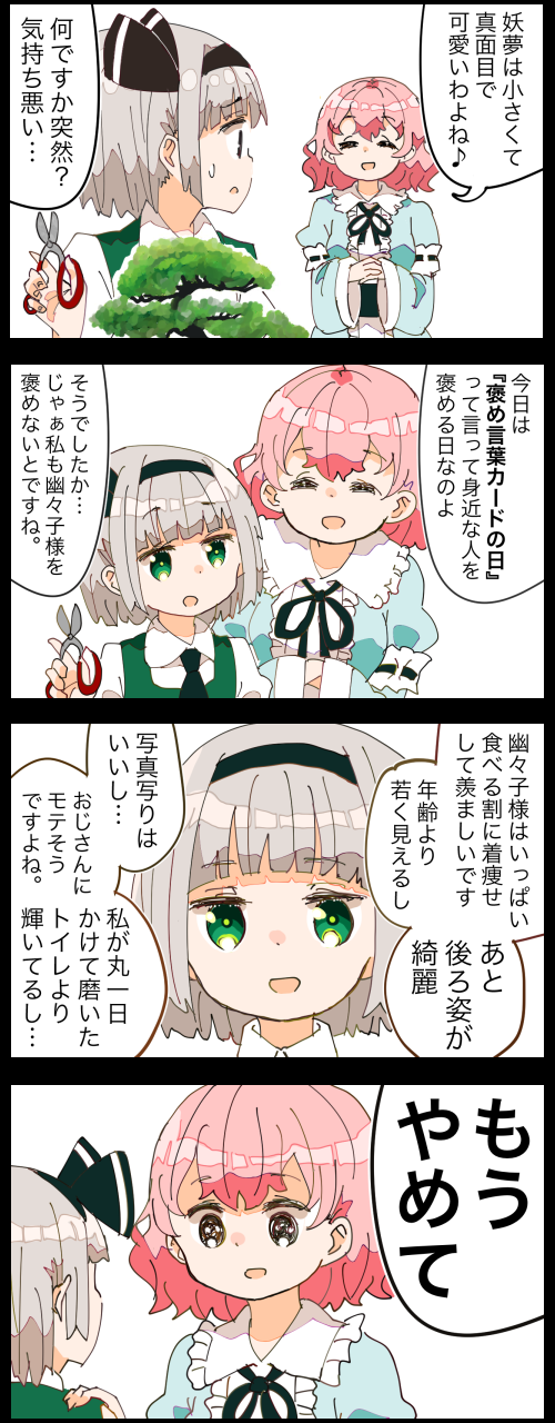 2girls 4koma ^_^ black_eyes bonsai bow closed_eyes comic green_eyes green_shirt hair_bow highres jetto_komusou konpaku_youmu blue_kimono multiple_girls missing_headwear pink_hair gardening_shears saigyouji_yuyuko shirt short_hair smile sweatdrop touhou translated white_hair