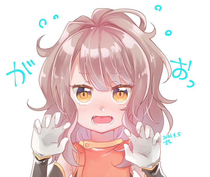 1girl blunt_bangs claw_pose close-up curly_hair dress elbow_gloves facing_viewer gao gloves grey_hair high_ponytail medium_hair number_pun open_mouth orange_dress ponytail raised_eyebrows shishiou_(tenka_hyakken) sidelocks sleeveless sleeveless_dress ssk_sasasa tenka_hyakken yellow_eyes