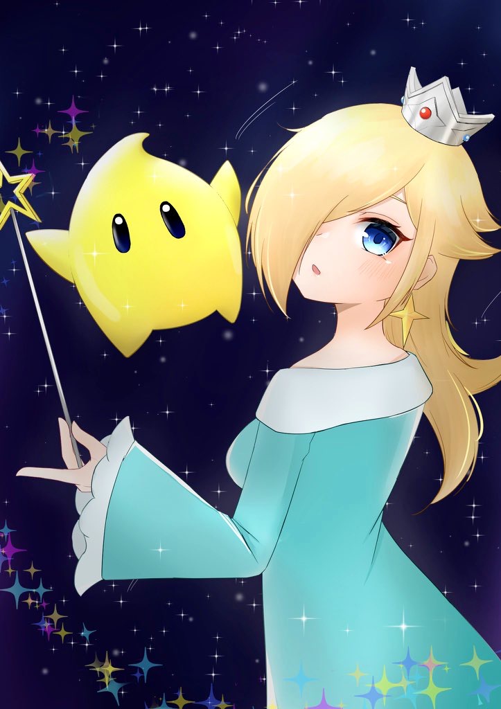 1girl aqua_eyes blonde_hair blue_eyes crown dress earrings hair_over_one_eye holding holding_wand jewelry looking_at_viewer luma_(mario) mario_(series) night nintendo off_shoulder parted_lips rosalina sky sparkle super_mario_galaxy tomatomiya wand