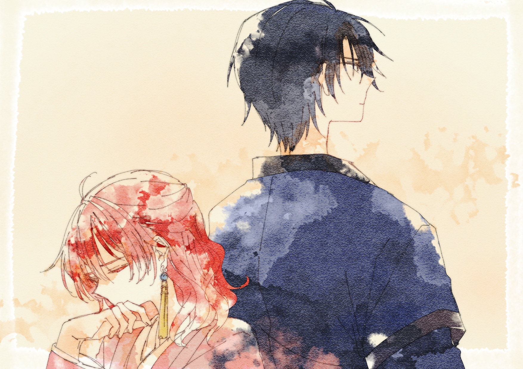 0819_chii 1boy 1girl akatsuki_no_yona back-to-back black_eyes black_hair blue_shirt closed_eyes closed_mouth hak_(akatsuki_no_yona) highres korean_clothes long_sleeves red_hair shirt short_hair sketch white_background yona_(akatsuki_no_yona)