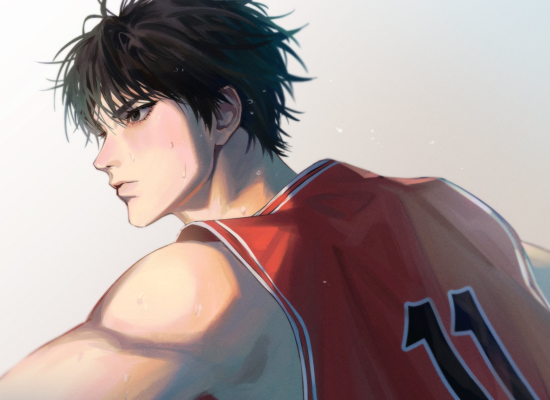 basketball_jersey basketball_uniform black_eyes black_hair grey_background hair_between_eyes highres korean_commentary looking_away male_focus miii_ii_i red_shirt rukawa_kaede shirt short_hair slam_dunk_(series) sleeveless sleeveless_shirt sportswear sweat