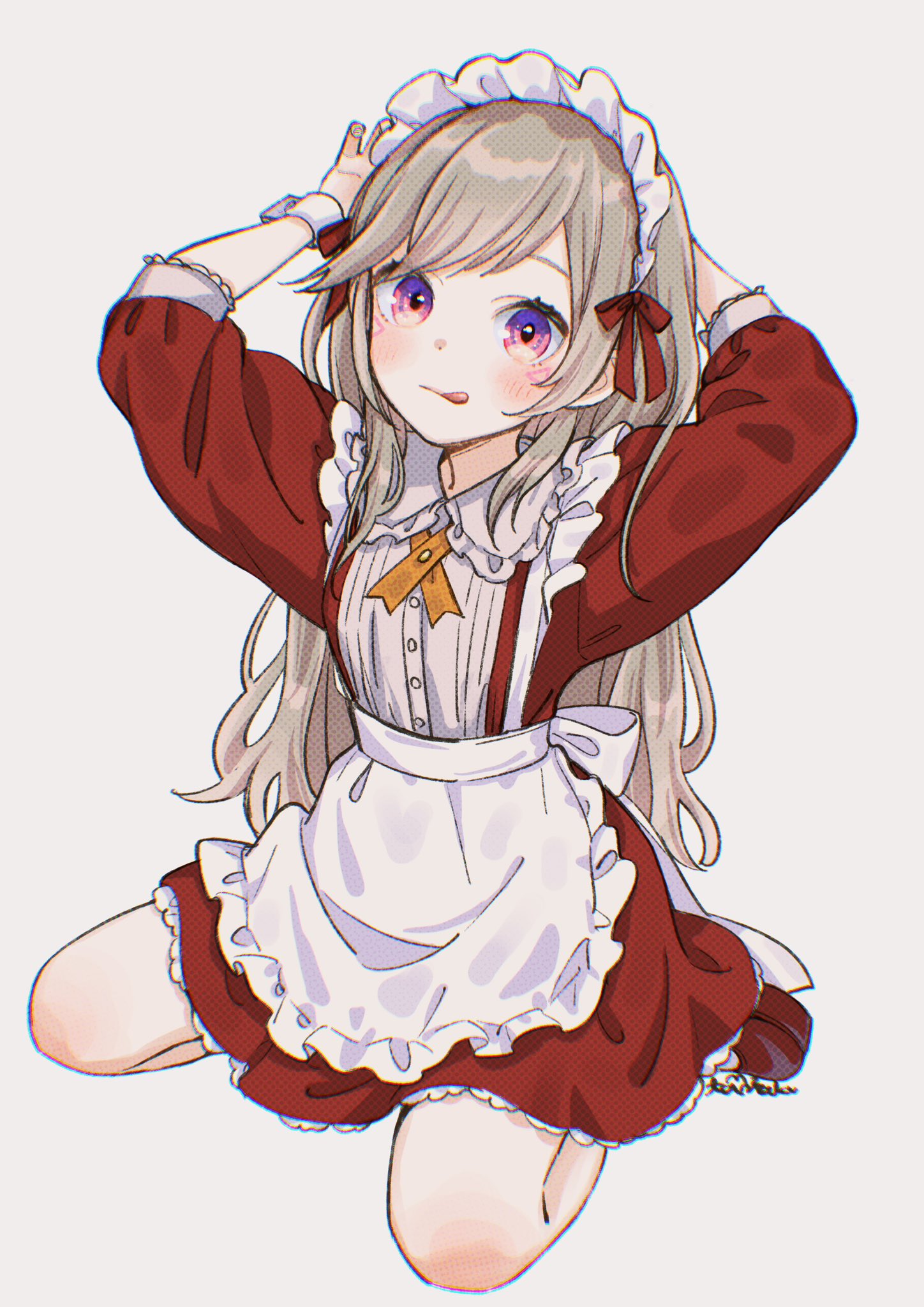 1girl apron arms_up blush bow collared_dress dress facial_mark grey_hair highres komori_met lace lace-trimmed_skirt lace-trimmed_sleeves lace_trim long_hair looking_at_viewer maid_headdress mizutamako orange_bow parted_bangs pleated_dress purple_eyes red_dress red_footwear shirt simple_background sitting skirt three-quarter_sleeves solo swept_bangs tongue tongue_out triangle triangle_facial_mark virtual_youtuber vspo! wariza white_apron white_background white_shirt wrist_cuffs